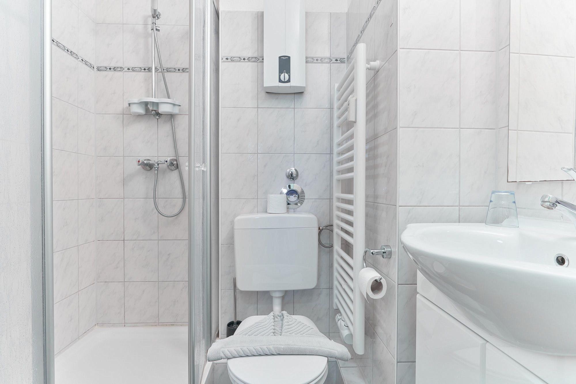 Modernes, hell gefliestes, kleines Bad mit Dusche, Toilette und Waschbecken.