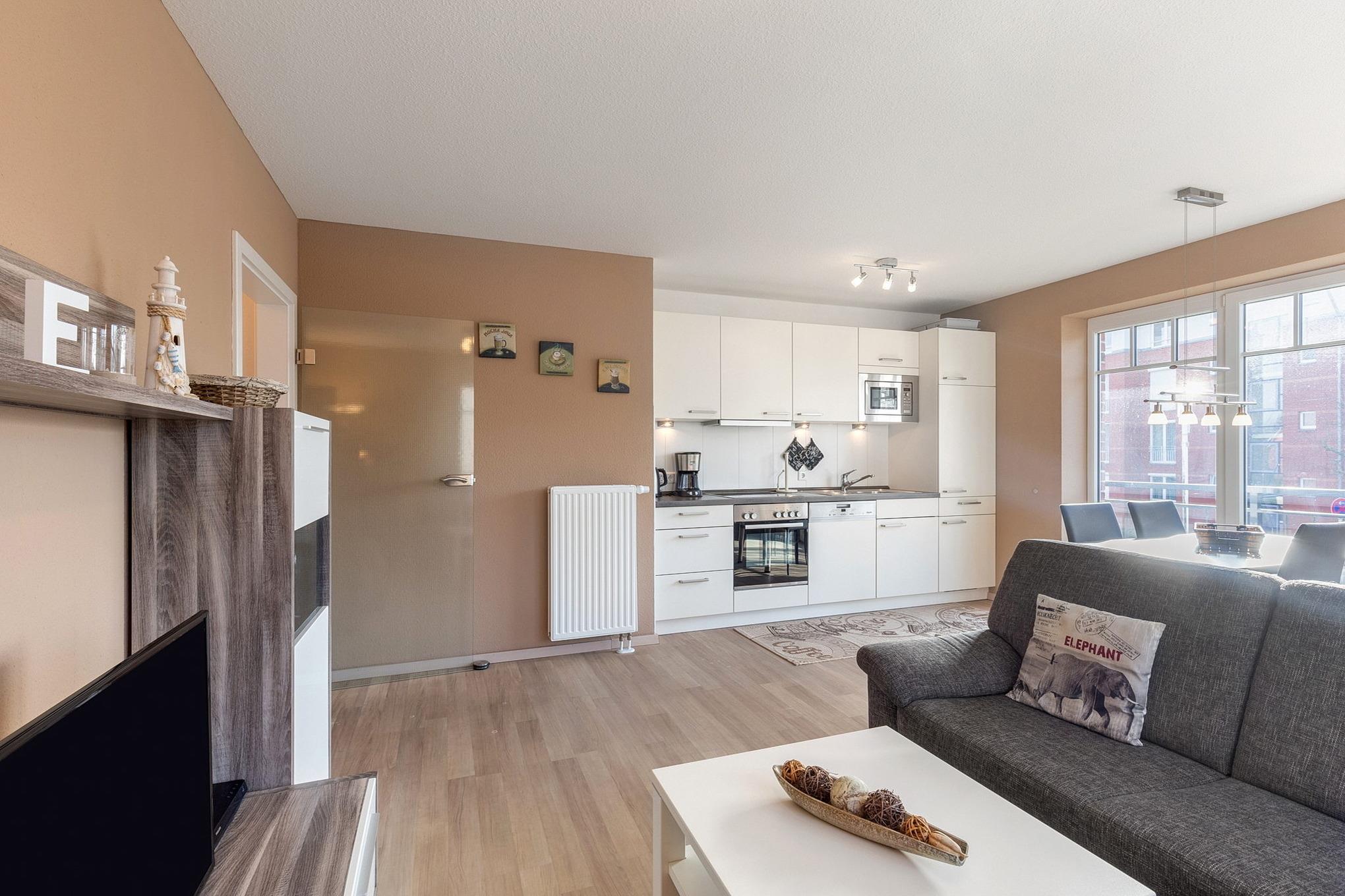 Moderne, zum Wohn- und Esszimmer offene, komplett ausgestattete Küche mit 4-Platten Cerankochfeld, Backofen, Spülmaschine, Kühlschrank mit kleinem 3-Sterne Gefrierfach, Mikrowelle, Kaffeemaschine und Mixer.