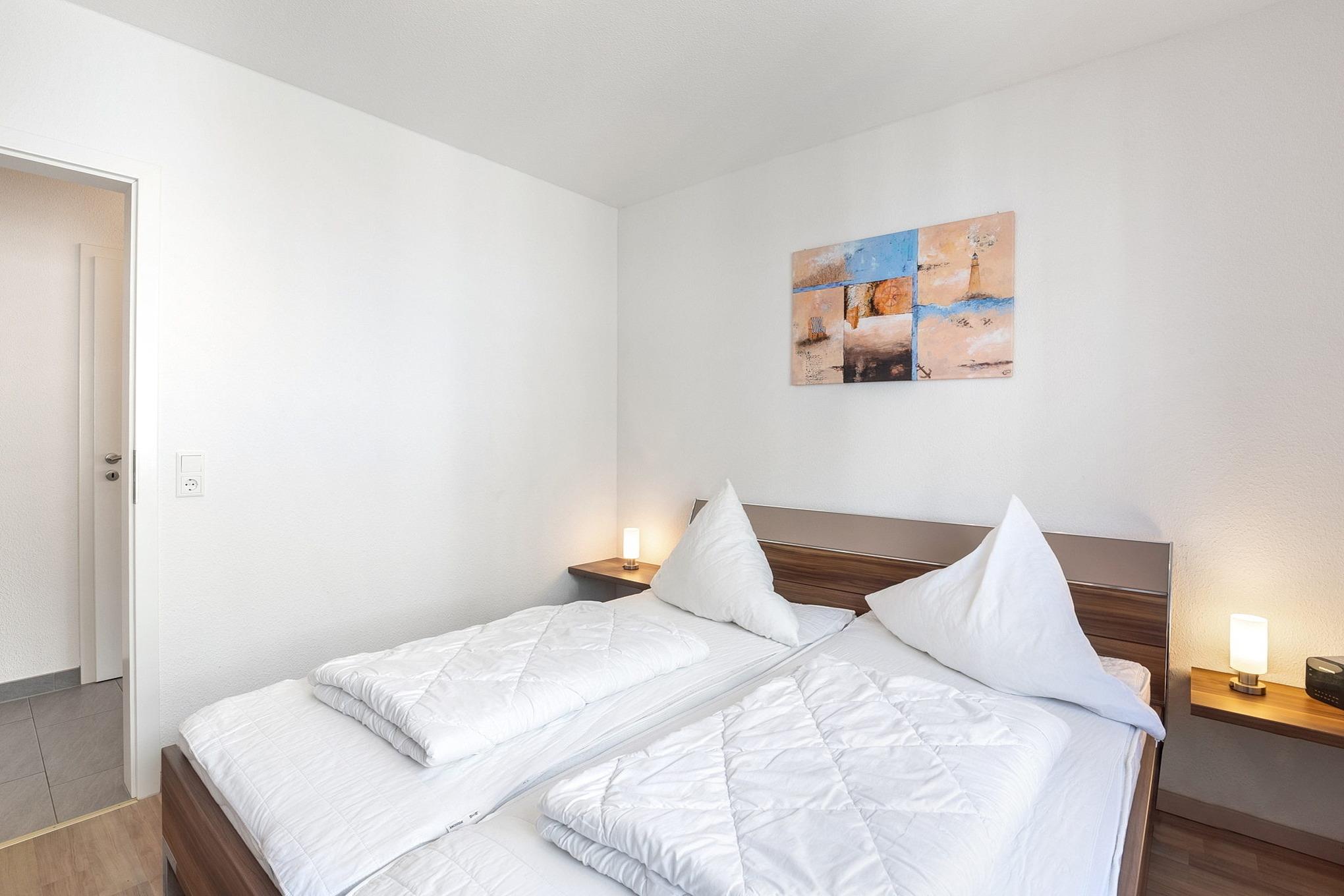 Separates, modern ausgestattetes Schlafzimmer mit einem Doppelbett (2x 90x200cm) und einem Kleiderschrank. Zur Unterhaltung steht ein Flachbildschirm zur Verfügung. Das Fenster lässt sich durch einen Außenrollladen vollständig verdunkeln.