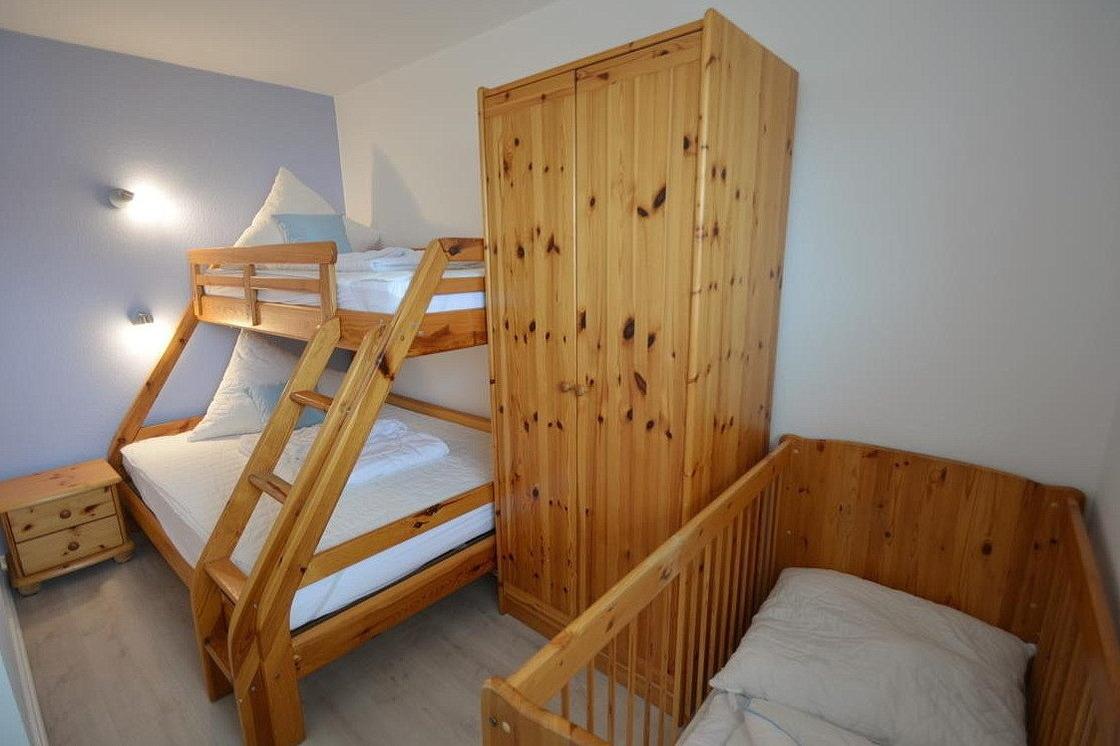 Das Kinderzimmer verfügt über ein Etagenbett (oben: 90x200cm, unten: 140x200cm), ein Kinderbettchen sowie einen 2-türigen Kleiderschrank. Der Raum ist mit Designerplanken ausgelegt und lässt sich durch Außenrollläden vollständig verdunkeln.