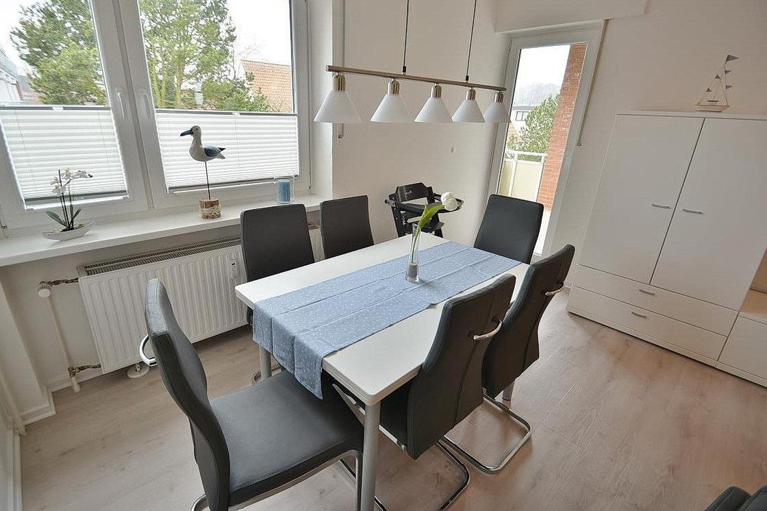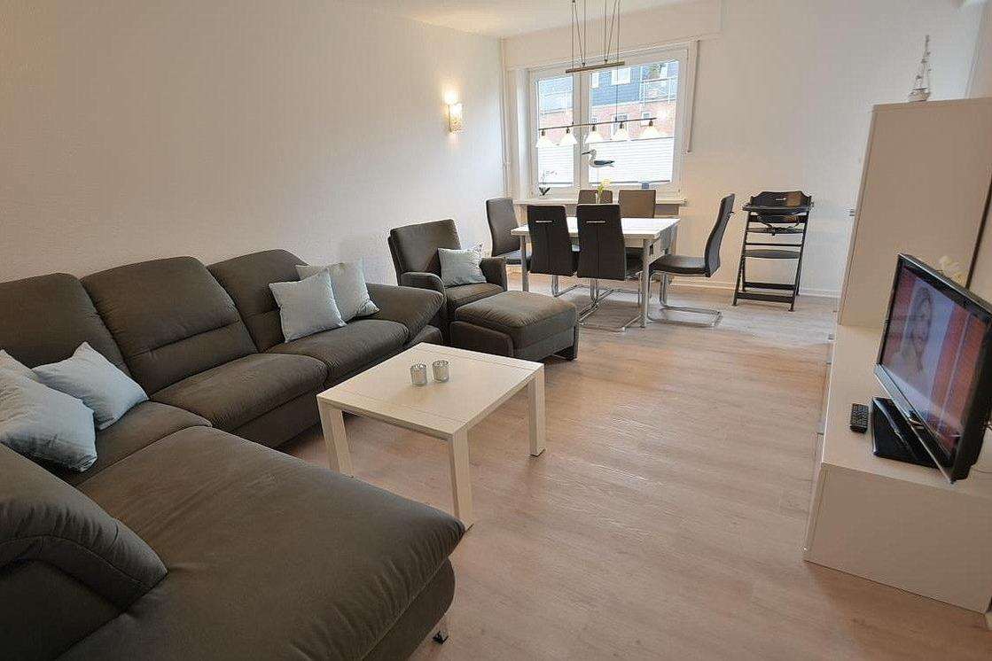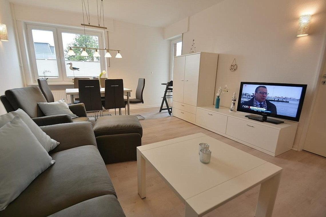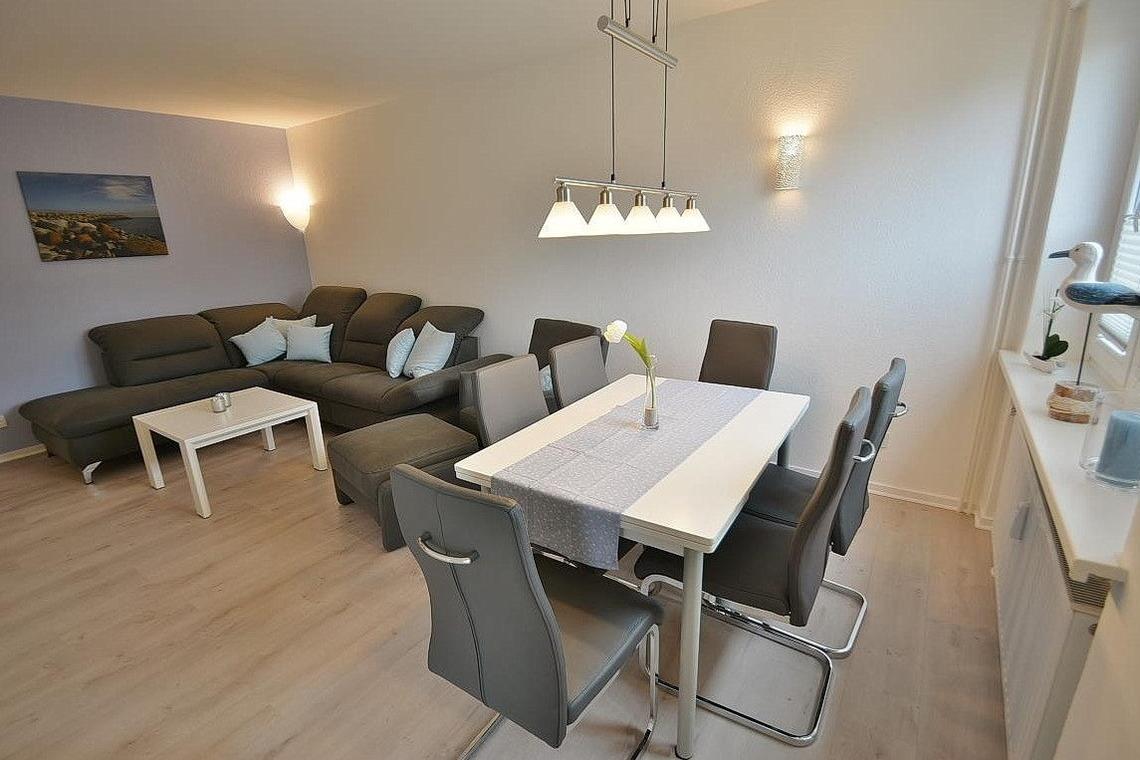 Der moderne helle Wohn- und Essbereich ist mit einer Eckcouch, einem Sessel mit Fußhocker und einem Couchtisch sowie einem Essplatz für 6 Personen ausgestattet. Zur Unterhaltung stehen ein Flachbild-Fernseher und Radio-CD-Spieler zur Verfügung.