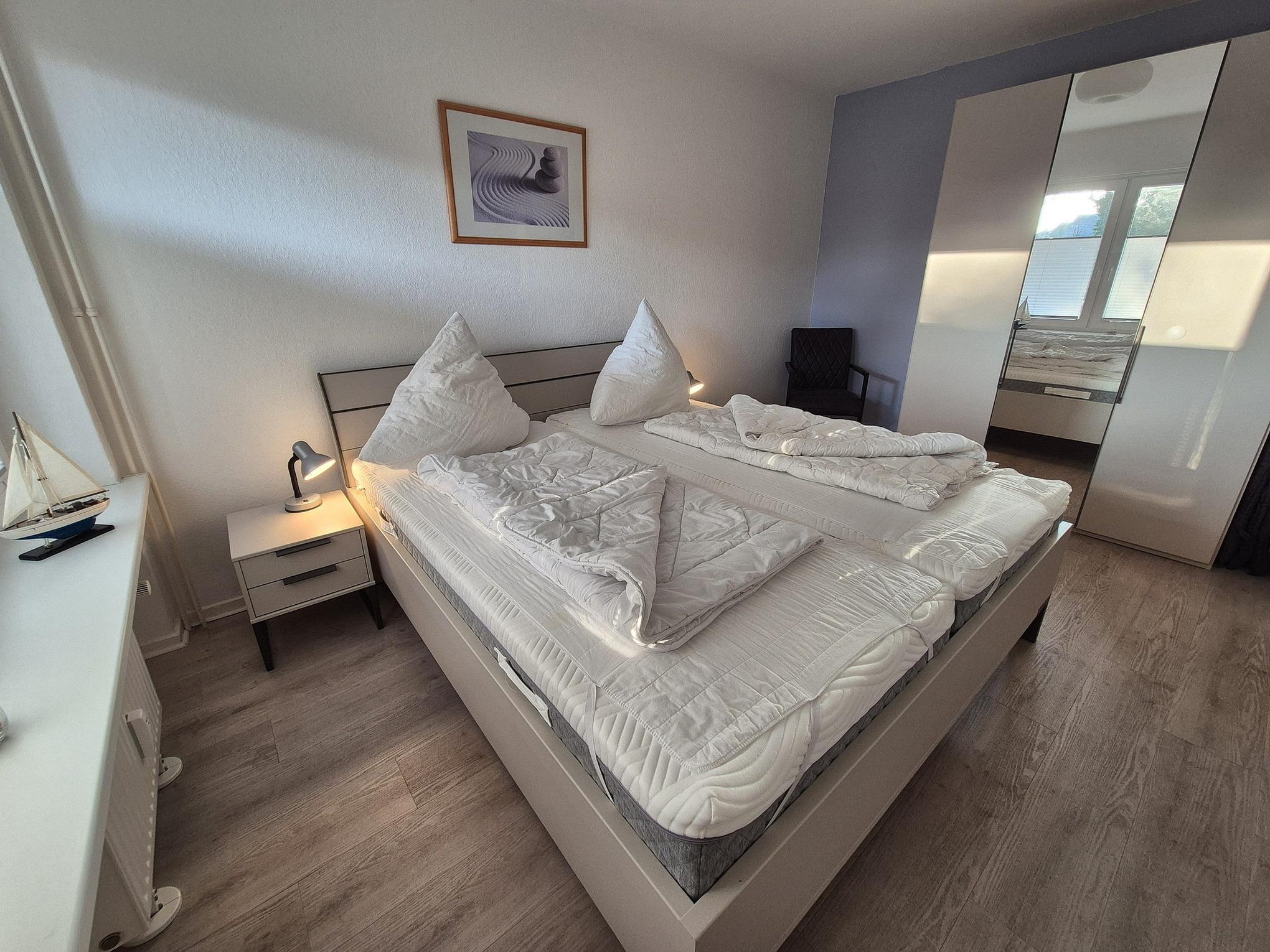 Das Schlafzimmer ist ausgestattet mit einem Doppelbett (2x90x200cm) und einem 2-türigen Kleiderschrank. Der Raum lässt sich durch Außenrollläden vollständig verdunkeln und ist mit Designerplanken ausgelegt.