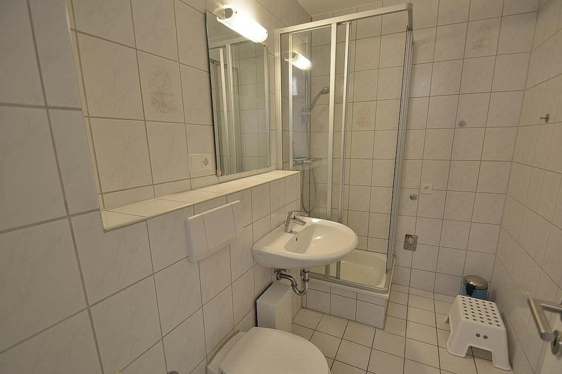 Helles, freundliches Bad mit Dusche, Waschbecken und WC.