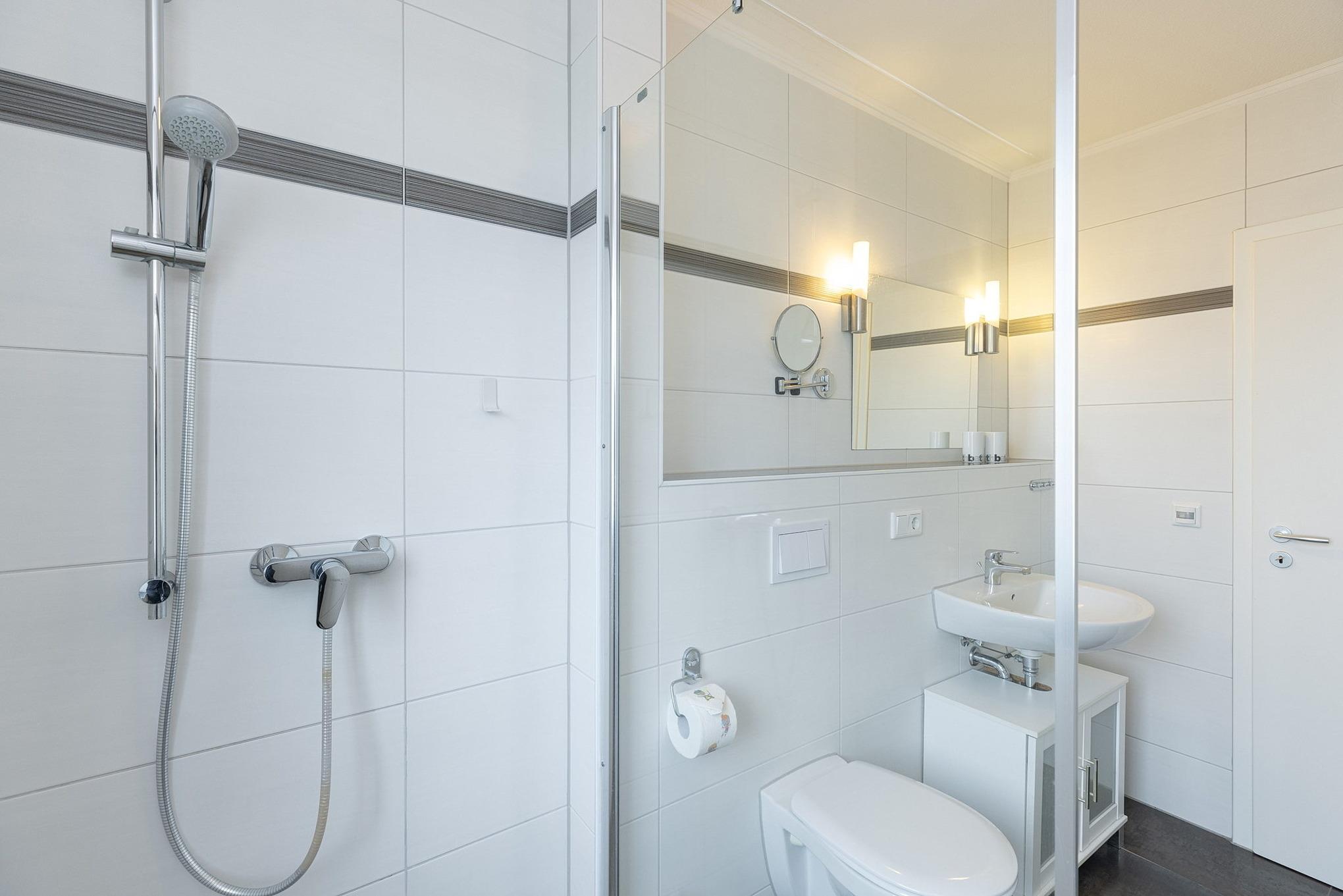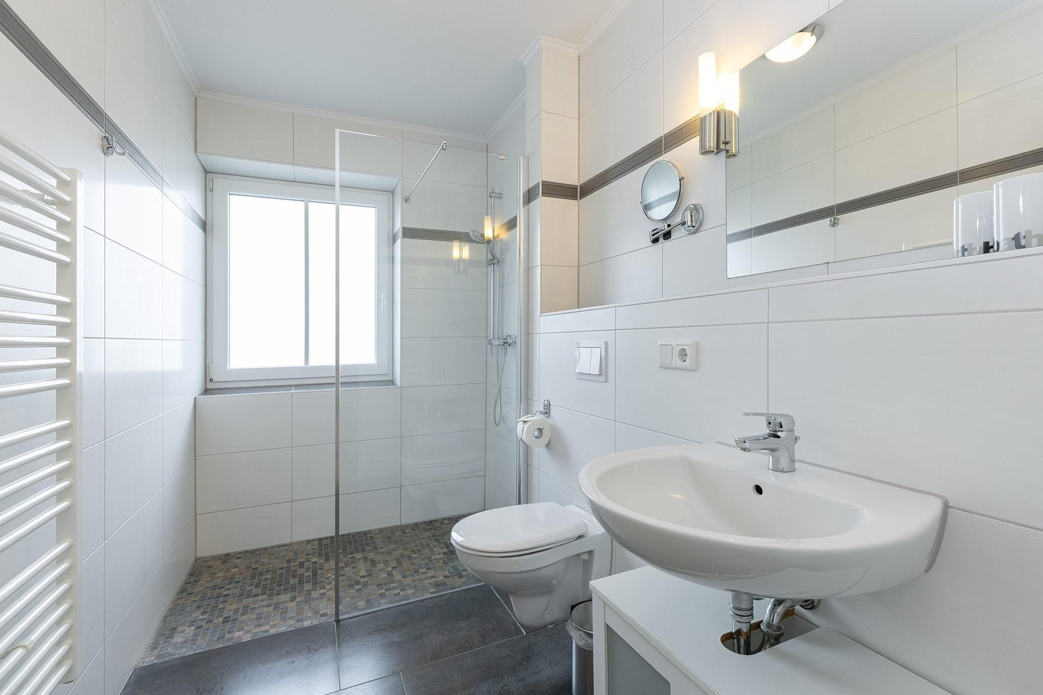 Modernes, hell gefliestes, barrierefreies Tageslichtbad mit Dusche, WC und Waschbecken. Das Bad verfügt über eine Fußbodenheizung.