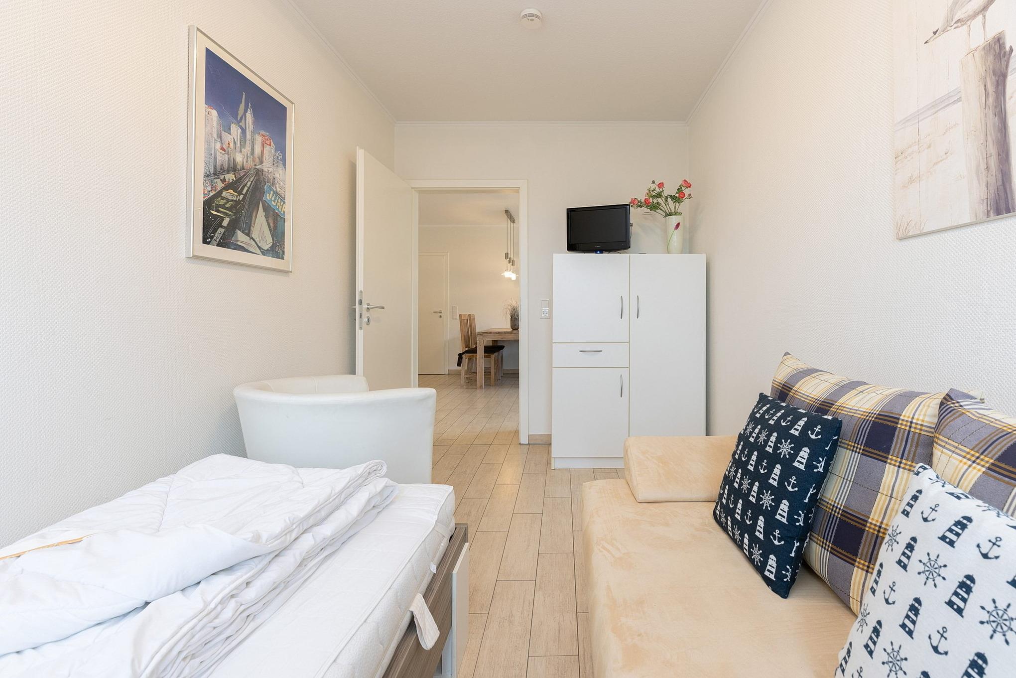Das 2. Schlafzimmer ist ausgestattet mit einem Einzelbett (90x200cm) und einem Sessel. Zur Unterhaltung steht auch hier ein Fernseher bereit. Der Raum ist mit Designer Planken ausgelegt, das Fenster lässt sich durch einen Vorhang verdunkeln.