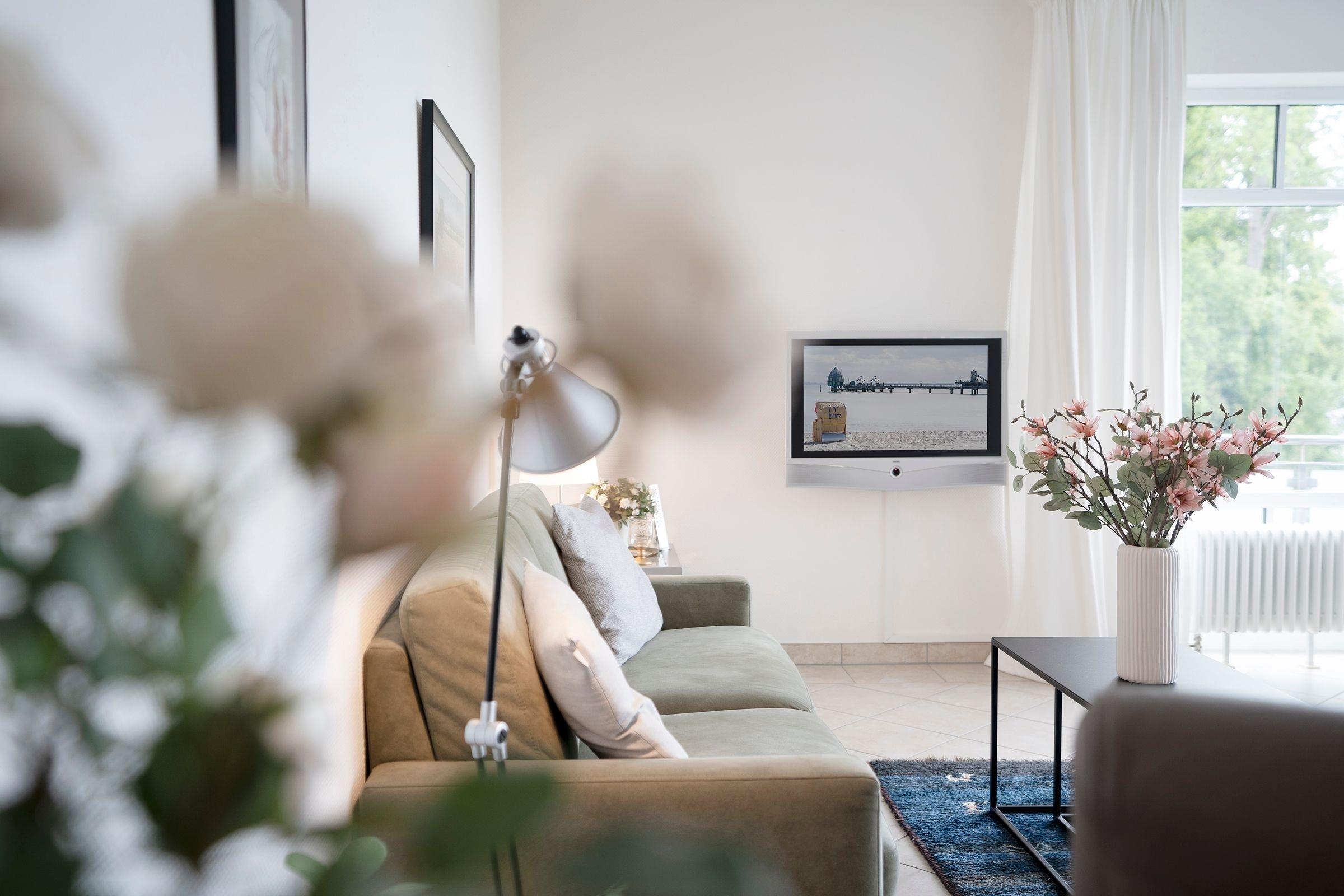 Genießen Sie den traumhaften Meerblick vom Balkon - Dank der Überdachung können Sie den Balkon auch bei nicht so gutem Wetter gemütlich und geschützt nutzen. Das geschmackvoll ausgestattete Wohnzimmer mit kuscheliger Sofalandschaft bietet zudem viel Platz zum Entspannen. Der Flachbildschirm und die Stereo-Anlage mit CD-Player sowie ein Design- Bluetooth Lautsprecher ermöglichen Ihnen die passende Urlaubsunterhaltung. Bereiten Sie in der gut ausgestatteten Küche Ihre Lieblingsspeisen zu oder genießen Sie einen Kaffee aus der Kapselmaschine. Das Schlafzimmer mit Doppelbett (2x 90x200 cm) sowie ein weiteres Schlafzimmer mit einem Einzelbett (90x200 cm) und einem zweiten Flachbildschirm-Fernseher garantieren erholsame Nächte. Einen guten Start in den Morgen ermöglicht das gepflegte Badezimmer mit Dusche, WC sowie zwei Waschbecken.