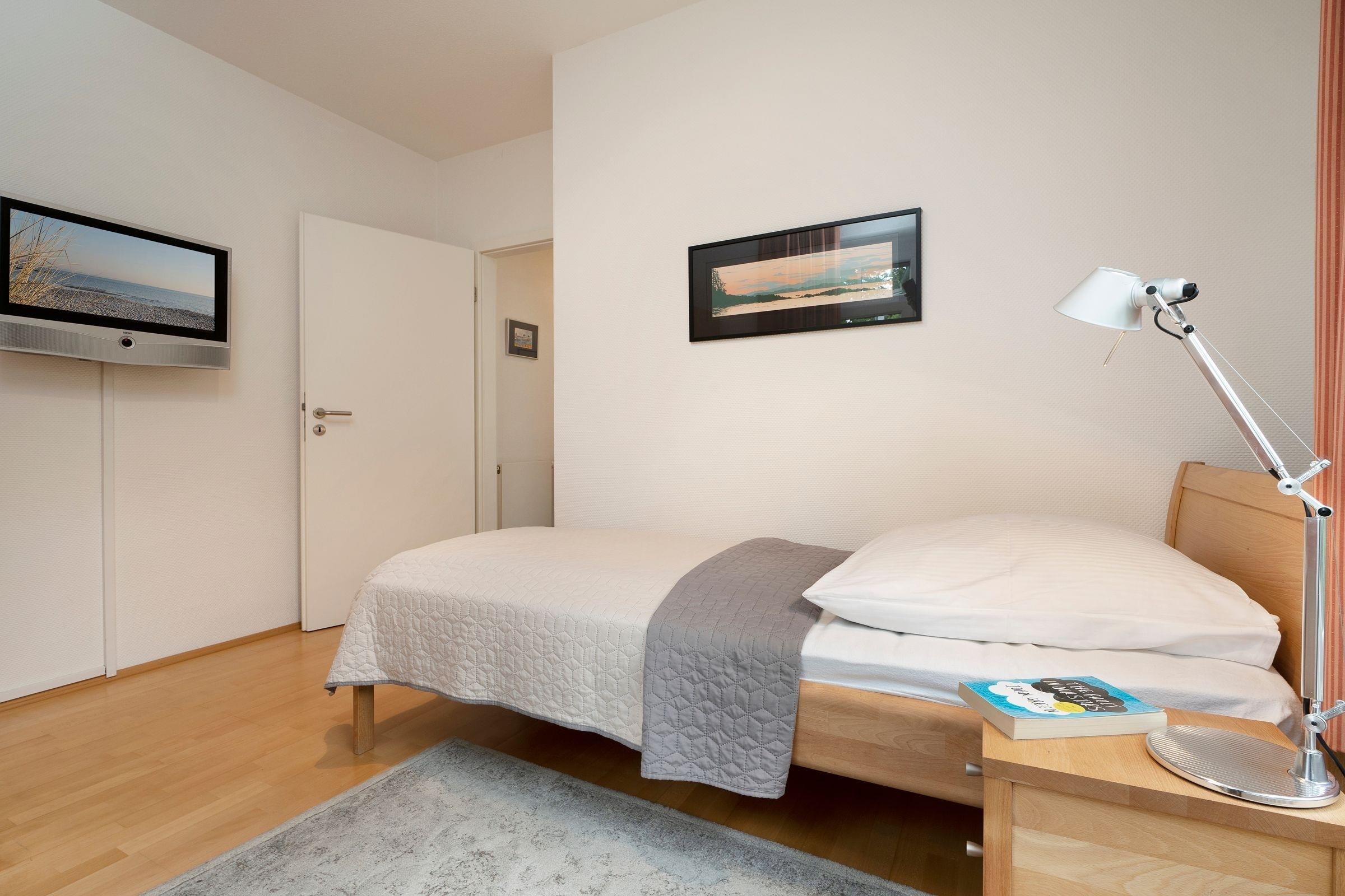 Schlafzimmer 2: 1 Einzelbett (90x200 cm), TV, Kleiderschrank