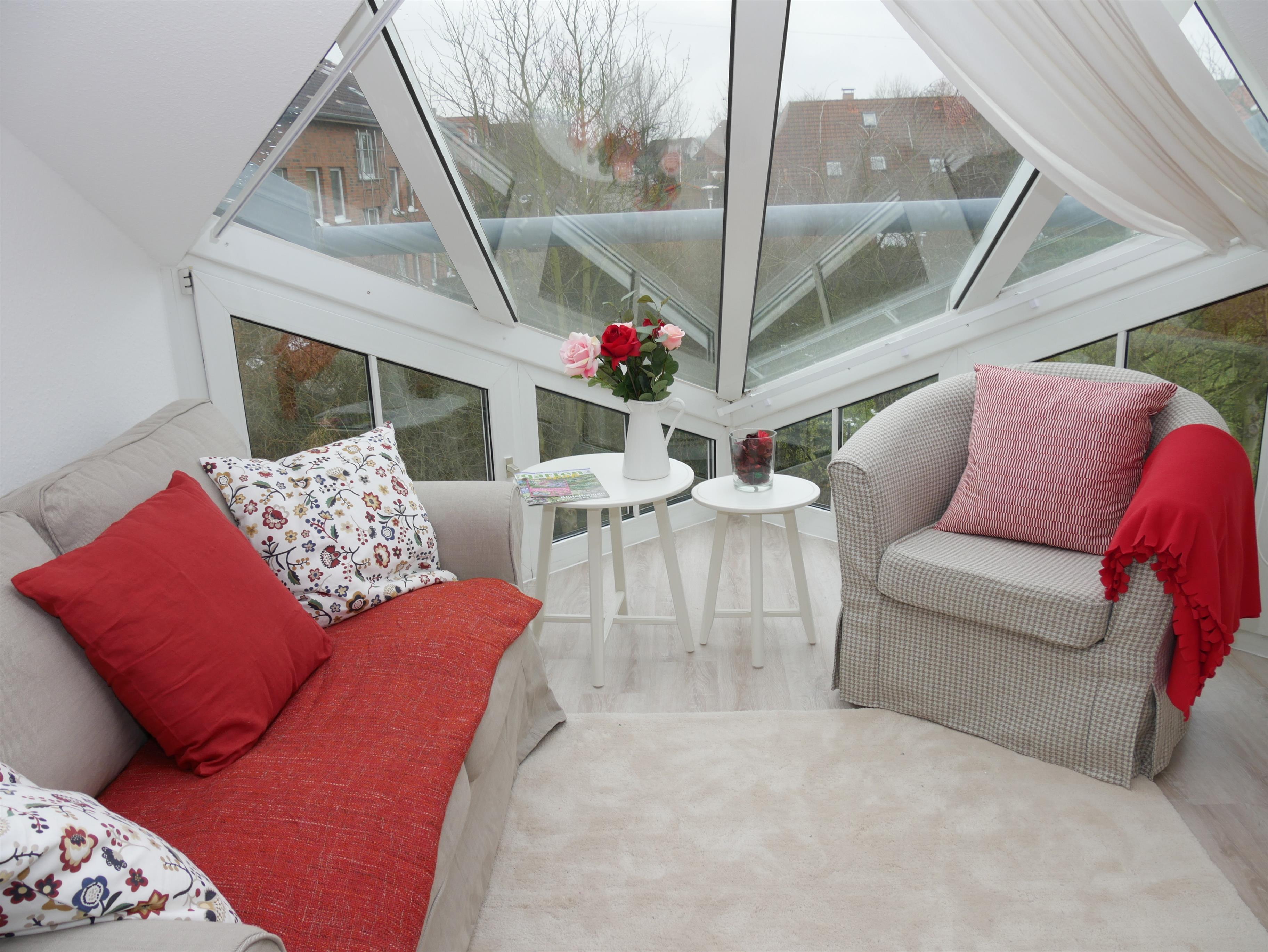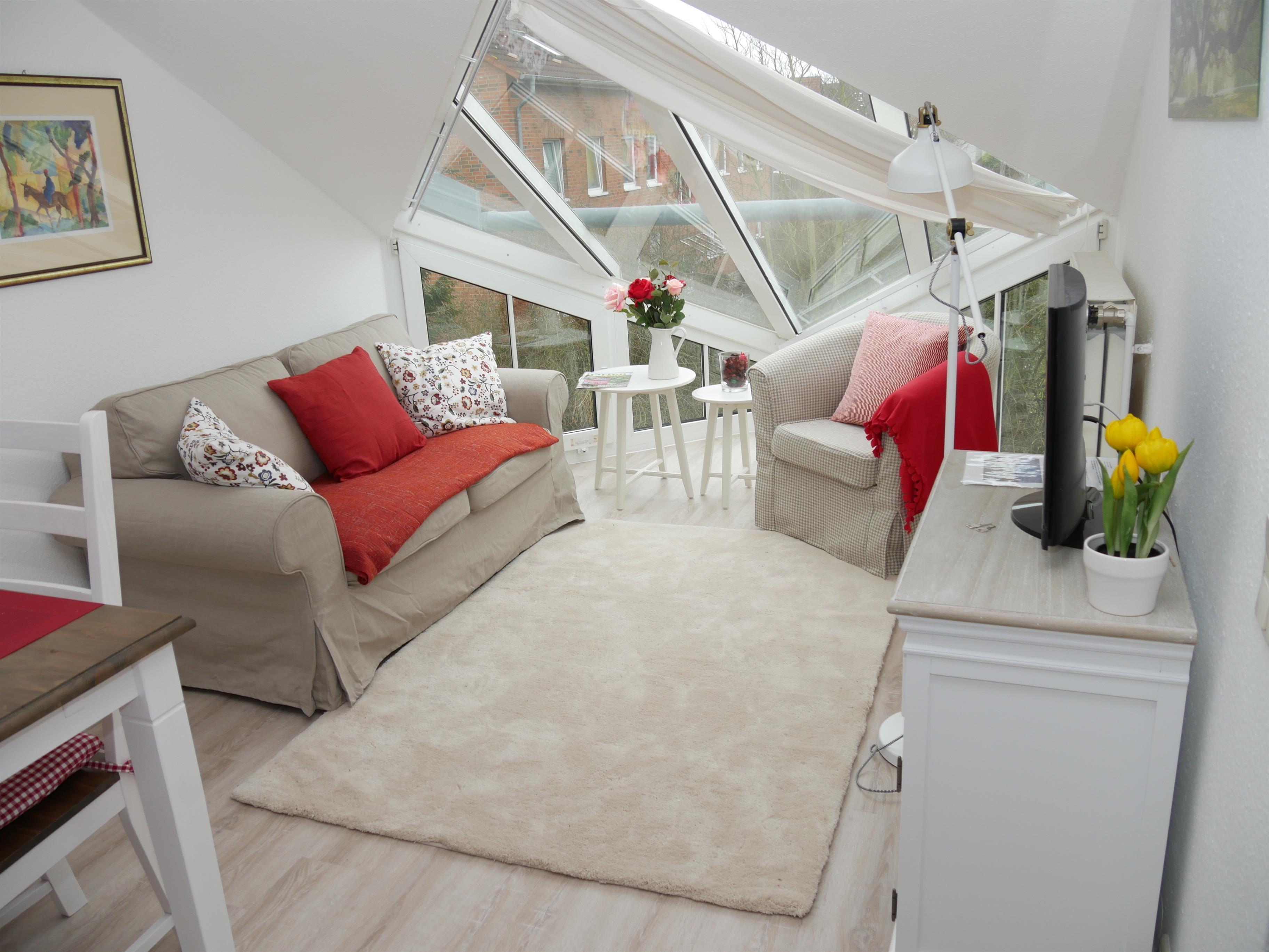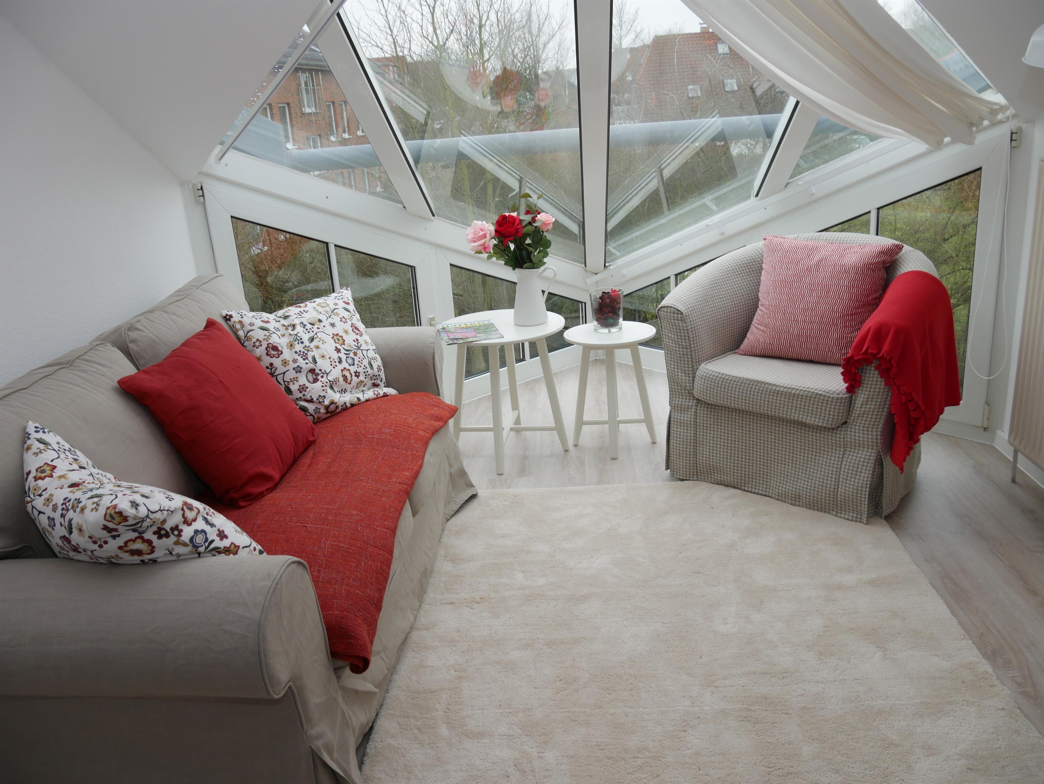 Die Ferienwohnung Nordstern ist modern, behaglich und mit viel Liebe zum Detail eingerichtet. Das Wohnzimmer in warmen Naturtönen lädt zum Entspannen, Lesen oder Fernsehen ein. Durch das große Fenster wirkt der Raum besonders hell und vermittelt das Gefühl, in einem kleinen Wintergarten zu sitzen.