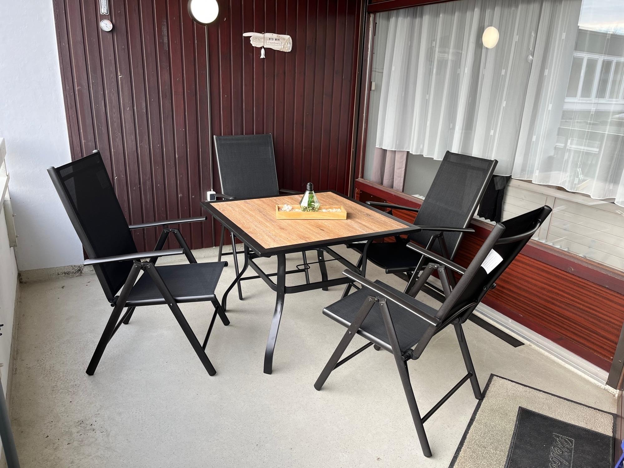 Vom Wohnbereich aus gelangen Sie auf den großen überdachten Balkon (Loggia) mit Teil-Seeblick, möbliert mit Rattan- Balkonmöbeln wie auch mit Sonnenliegen und Sonnenschirm.