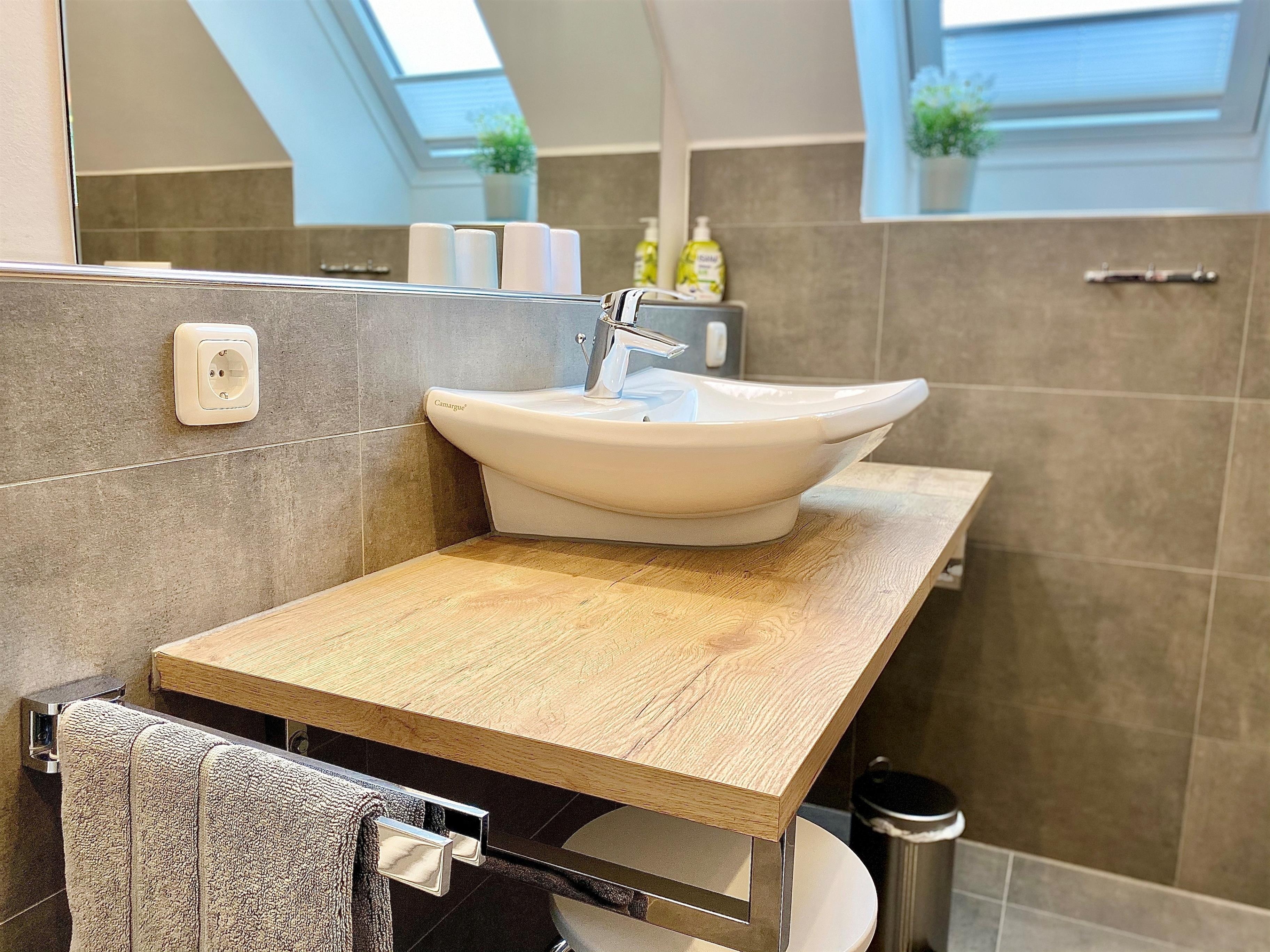 Das Schlafzimmer ist mit einem Boxspringbett (je 90 x 200 cm) und 2-türigem Kleiderschrank eingerichtet. Auch im Flur bietet ein weiterer Schrank genügend Platz. Das Duschbad wird durch ein Fenster vom Tageslicht erhellt.