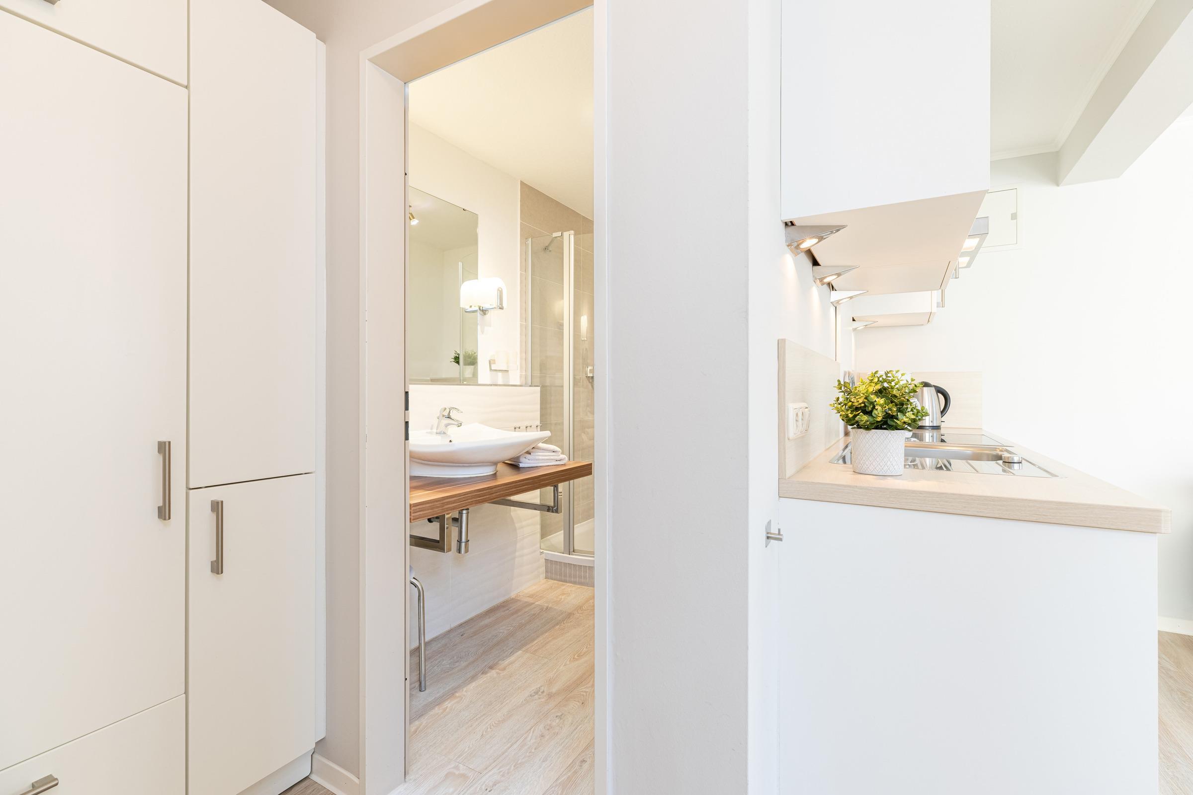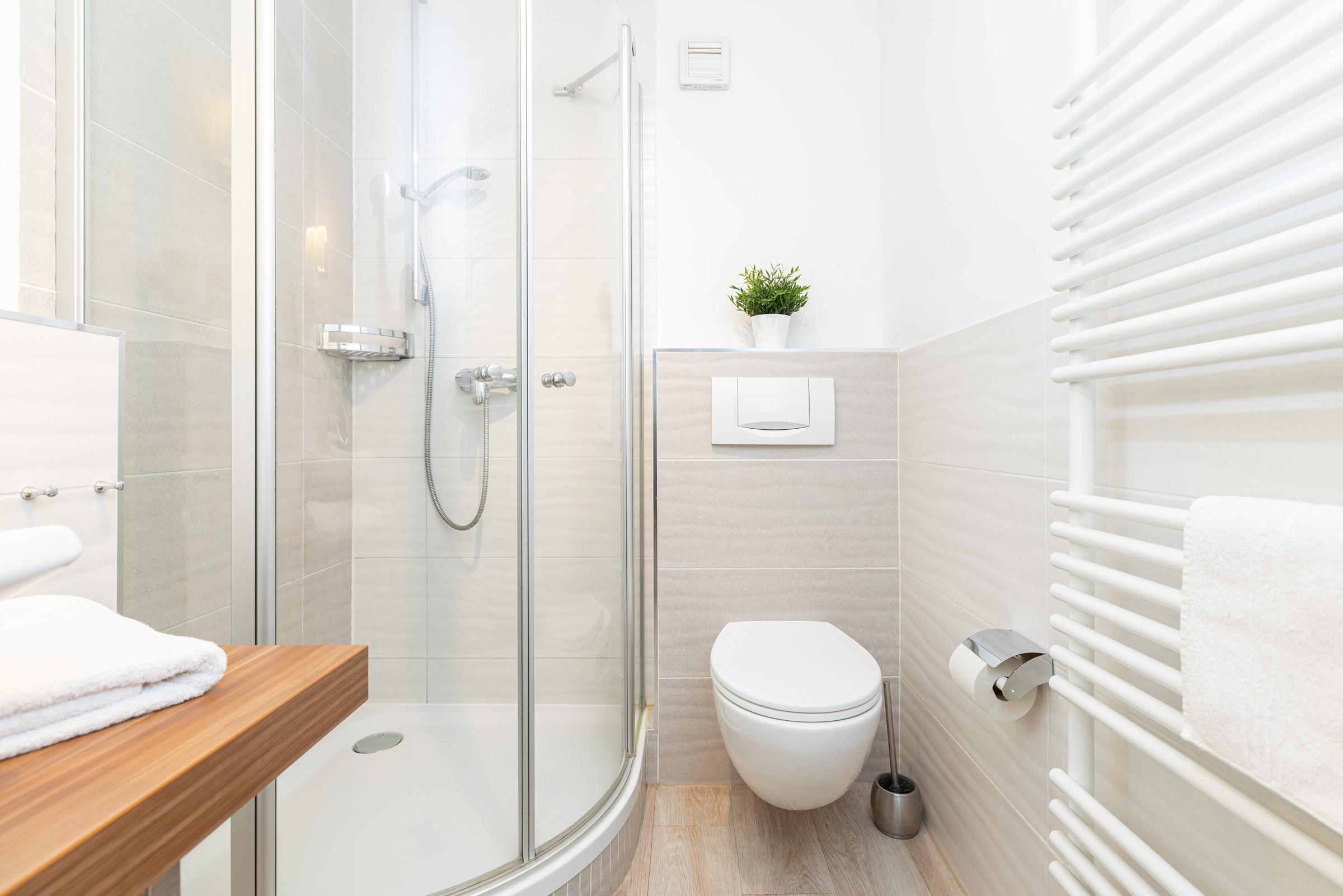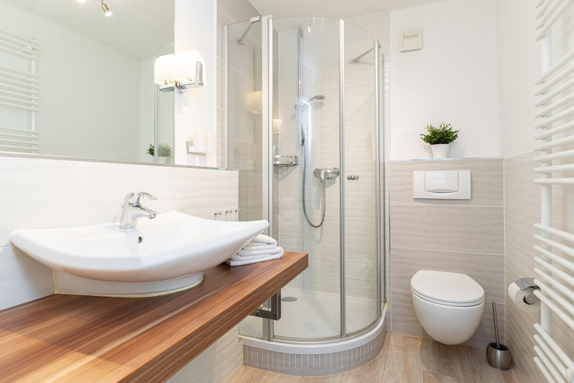 Direkt gegenüber liegt das moderne Duschbad.