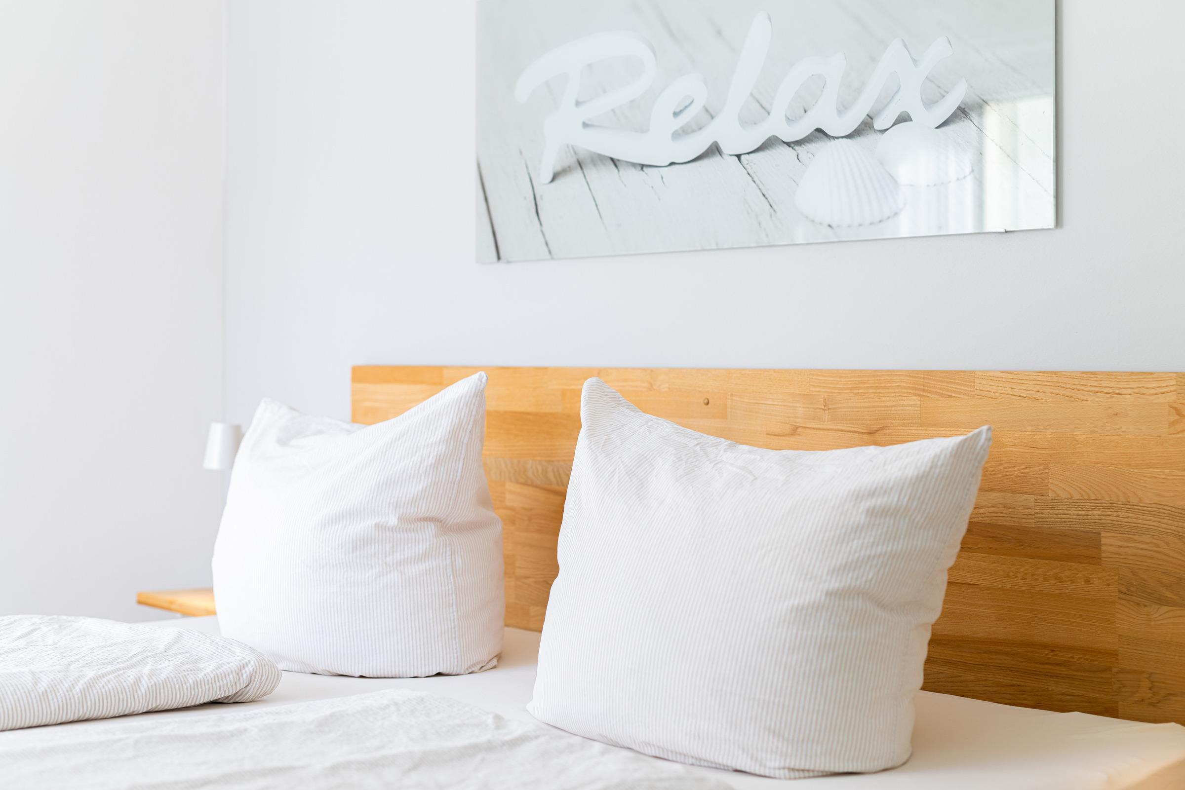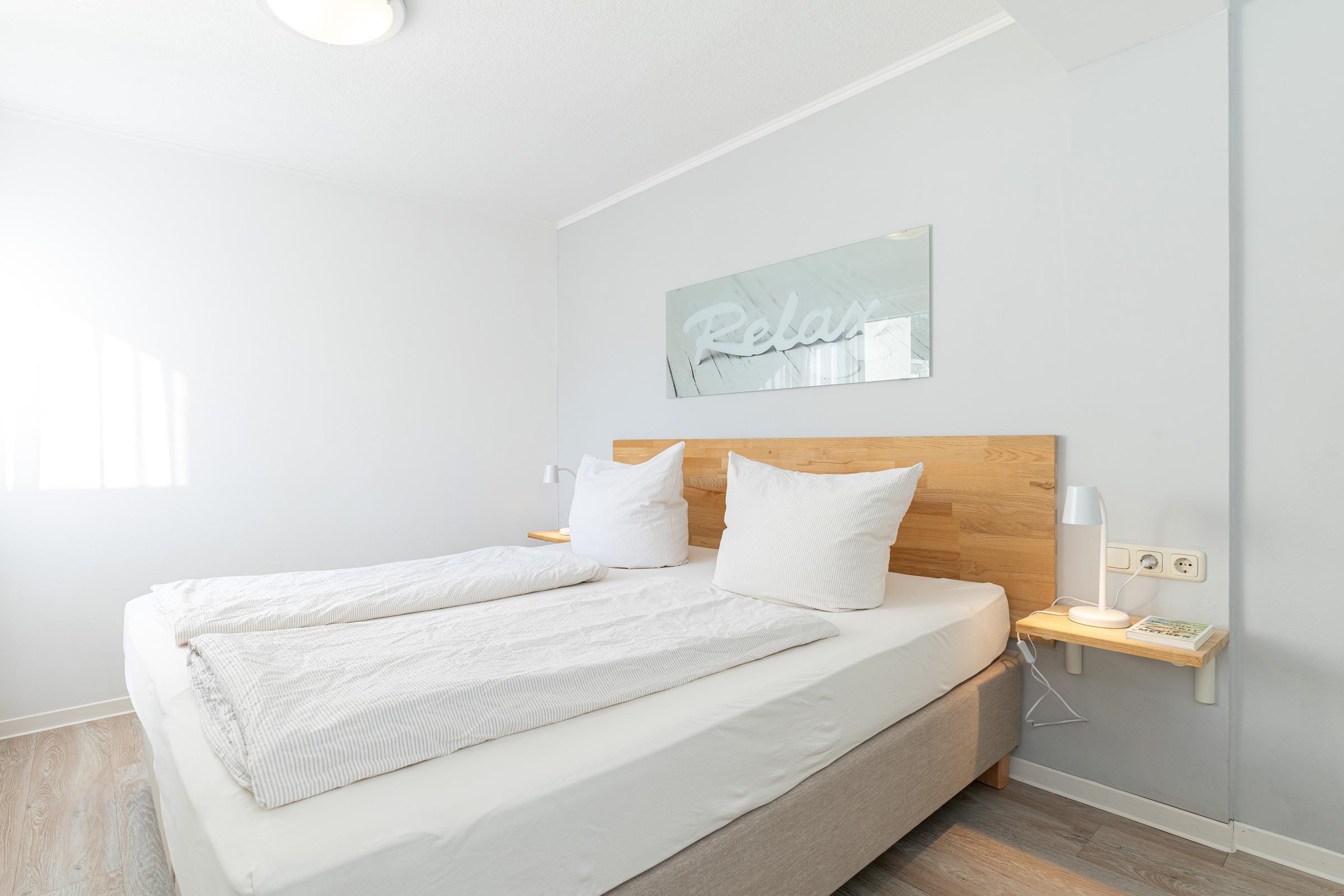 Das Schlafzimmer mit großem Fenster und Wand-TV besteht aus einem Doppelbett (Boxspring, je 90 x 200 cm), hat einen geräumigen Kleiderschrank und ist ebenfalls mit PVC-Designboden ausgelegt.