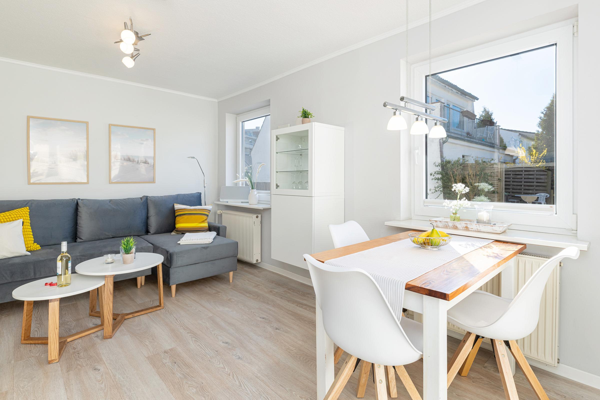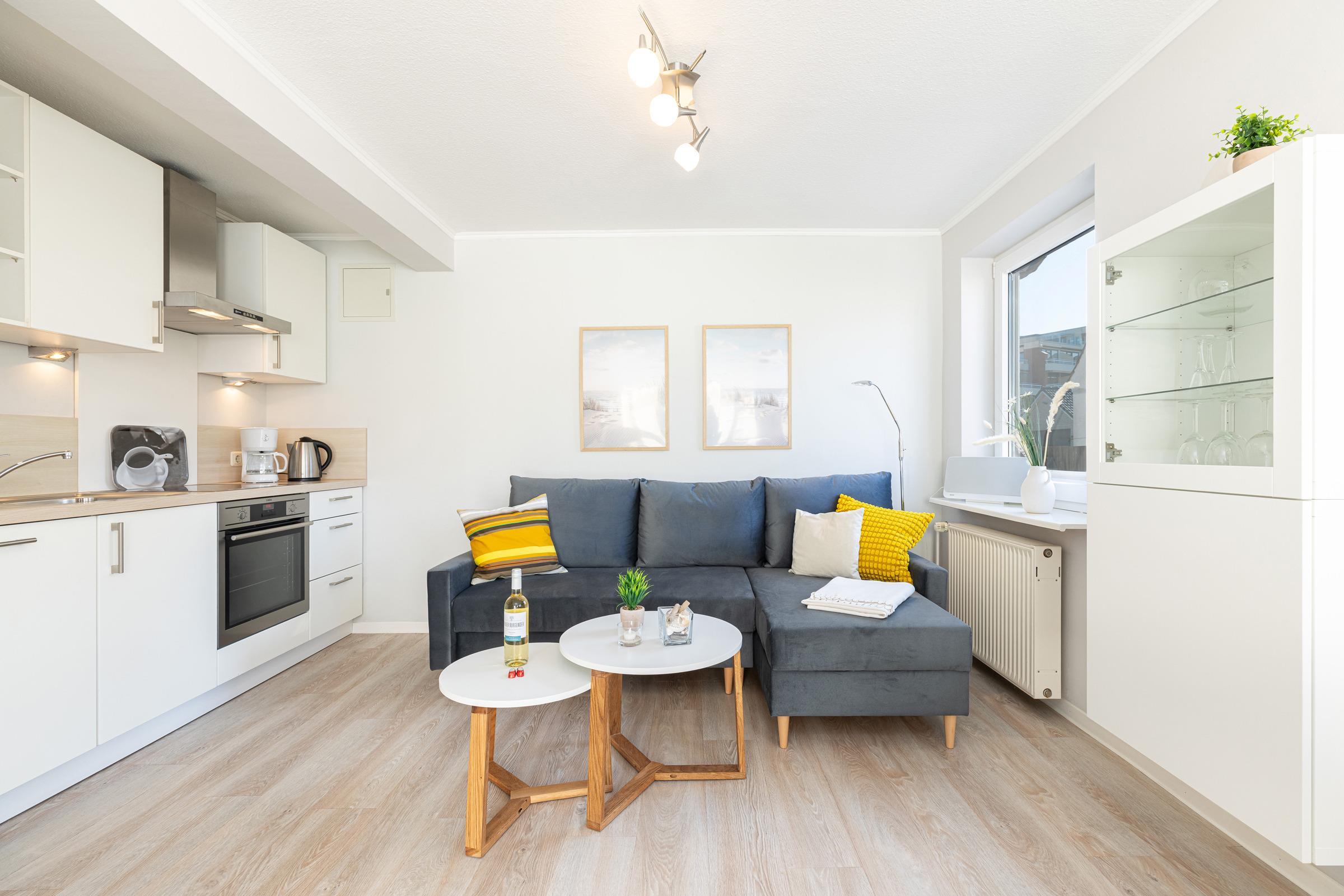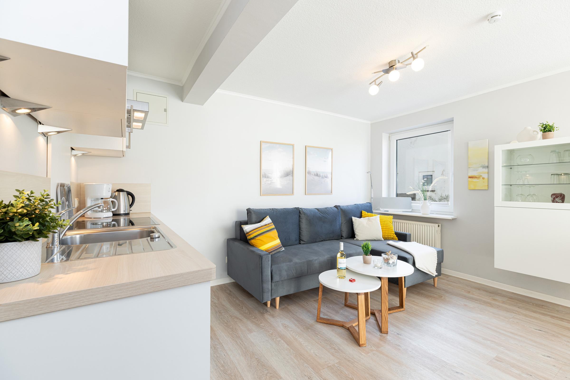 Hell und sonnig erscheint das moderne in 2025 neu eingerichtete Wohnzimmer mit Schlafsofa und Essplatz sowie Küchenzeile. Es wirkt frisch und hygienisch durch den hellen PVC-Designboden.