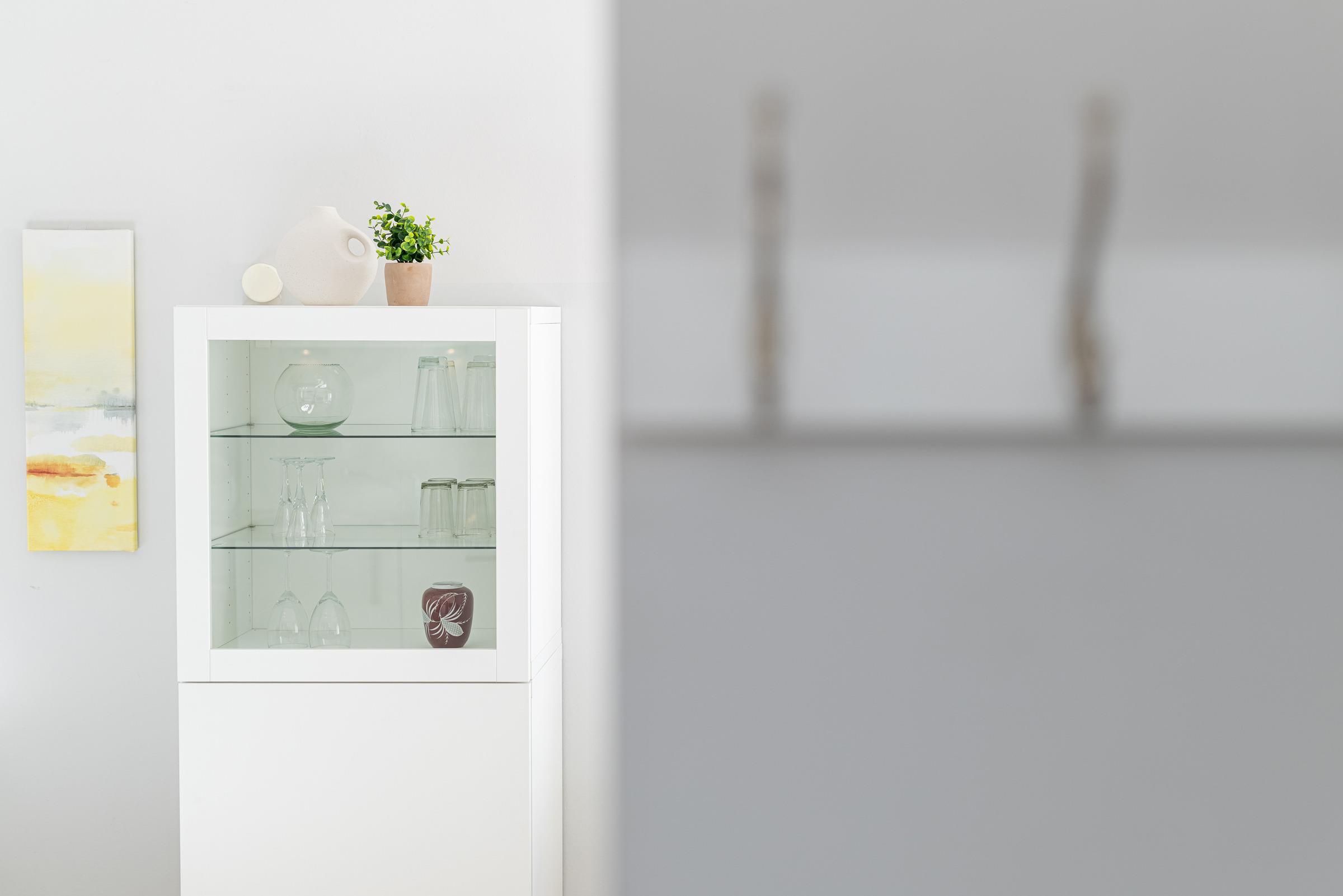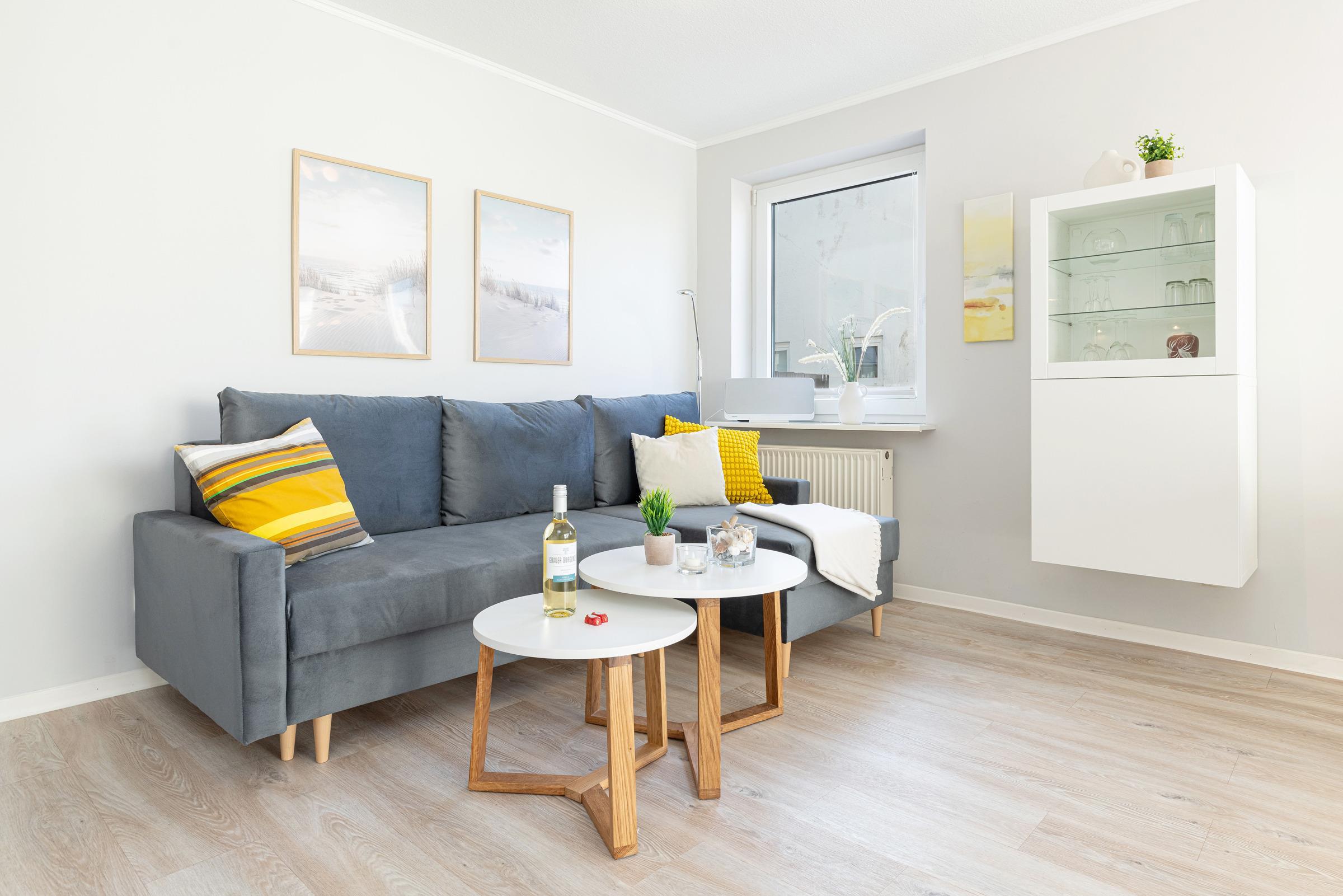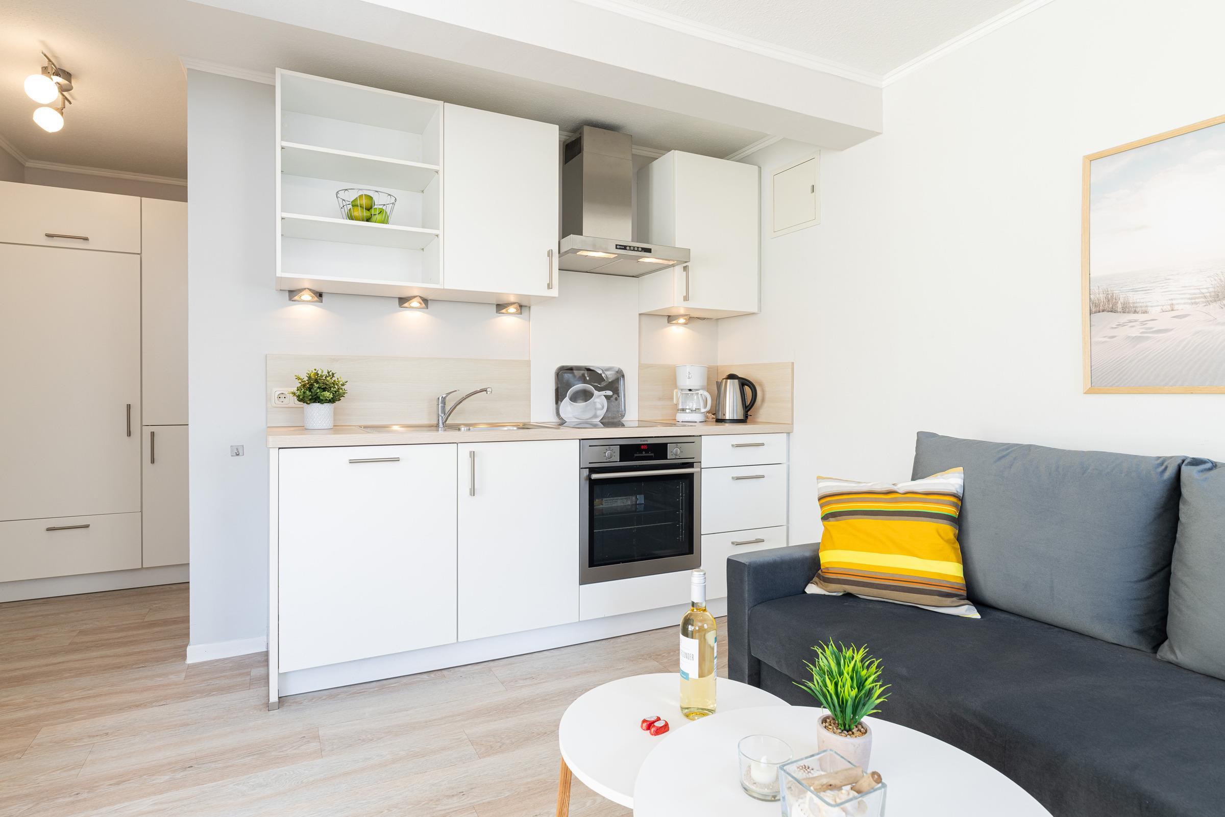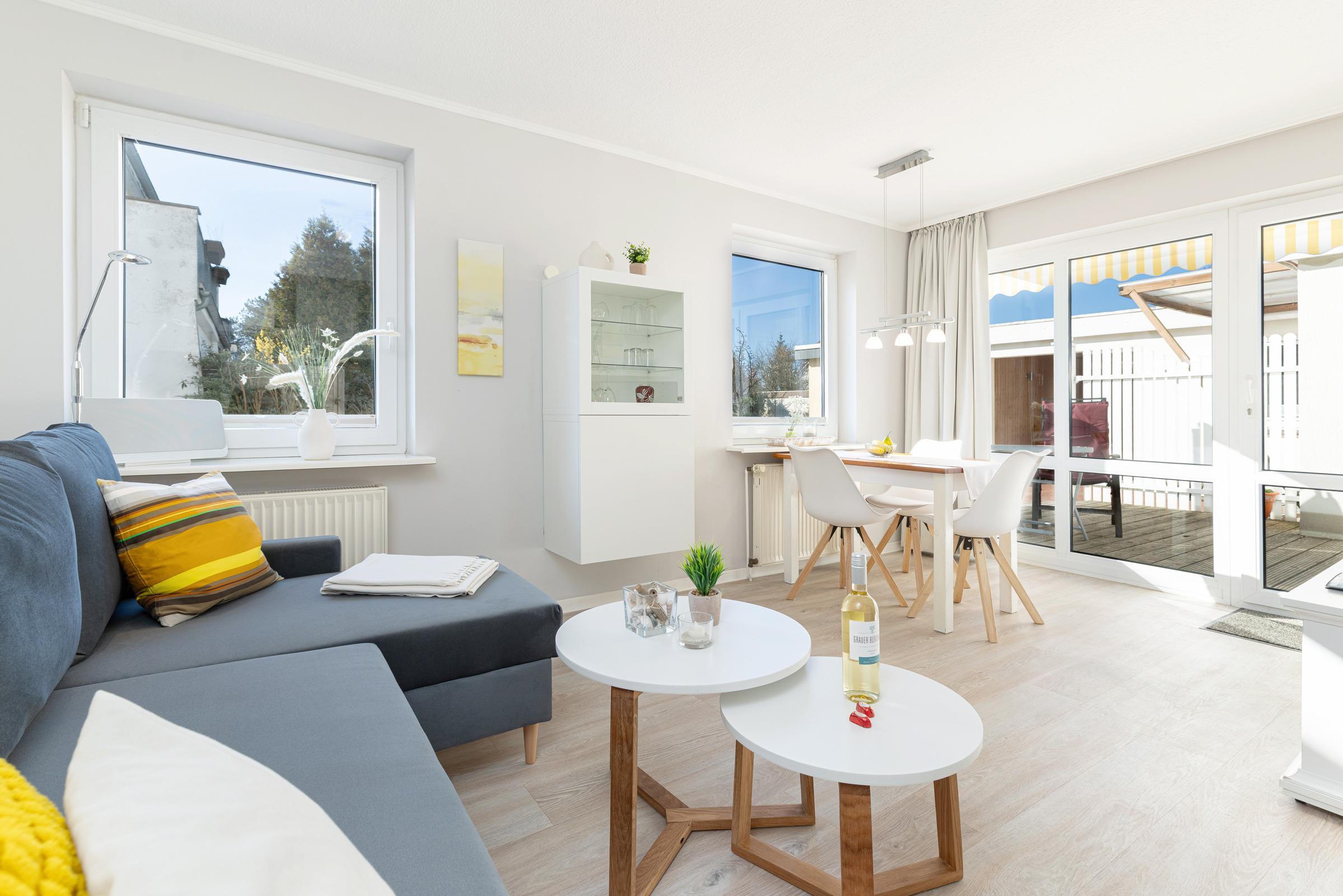 Hell und sonnig erscheint das moderne in 2025 neu eingerichtete Wohnzimmer mit Schlafsofa und Essplatz sowie Küchenzeile. Es wirkt frisch und hygienisch durch den hellen PVC-Designboden.