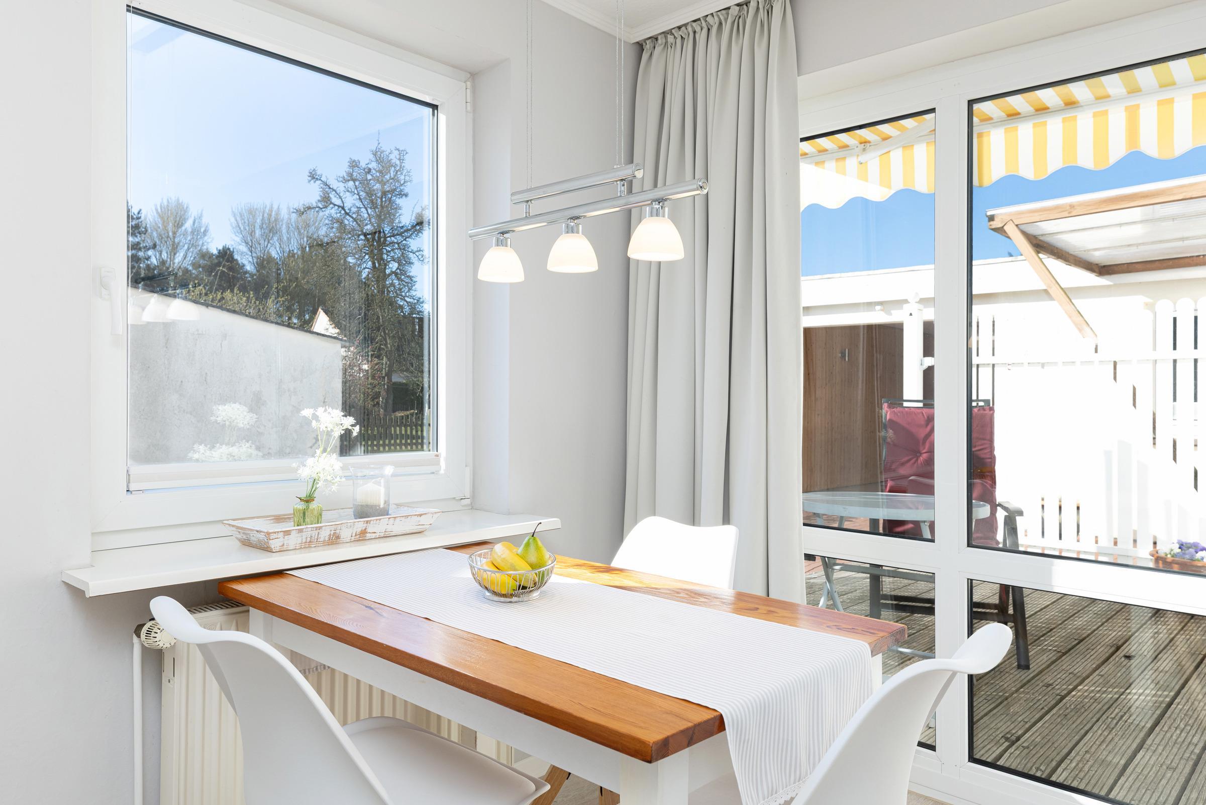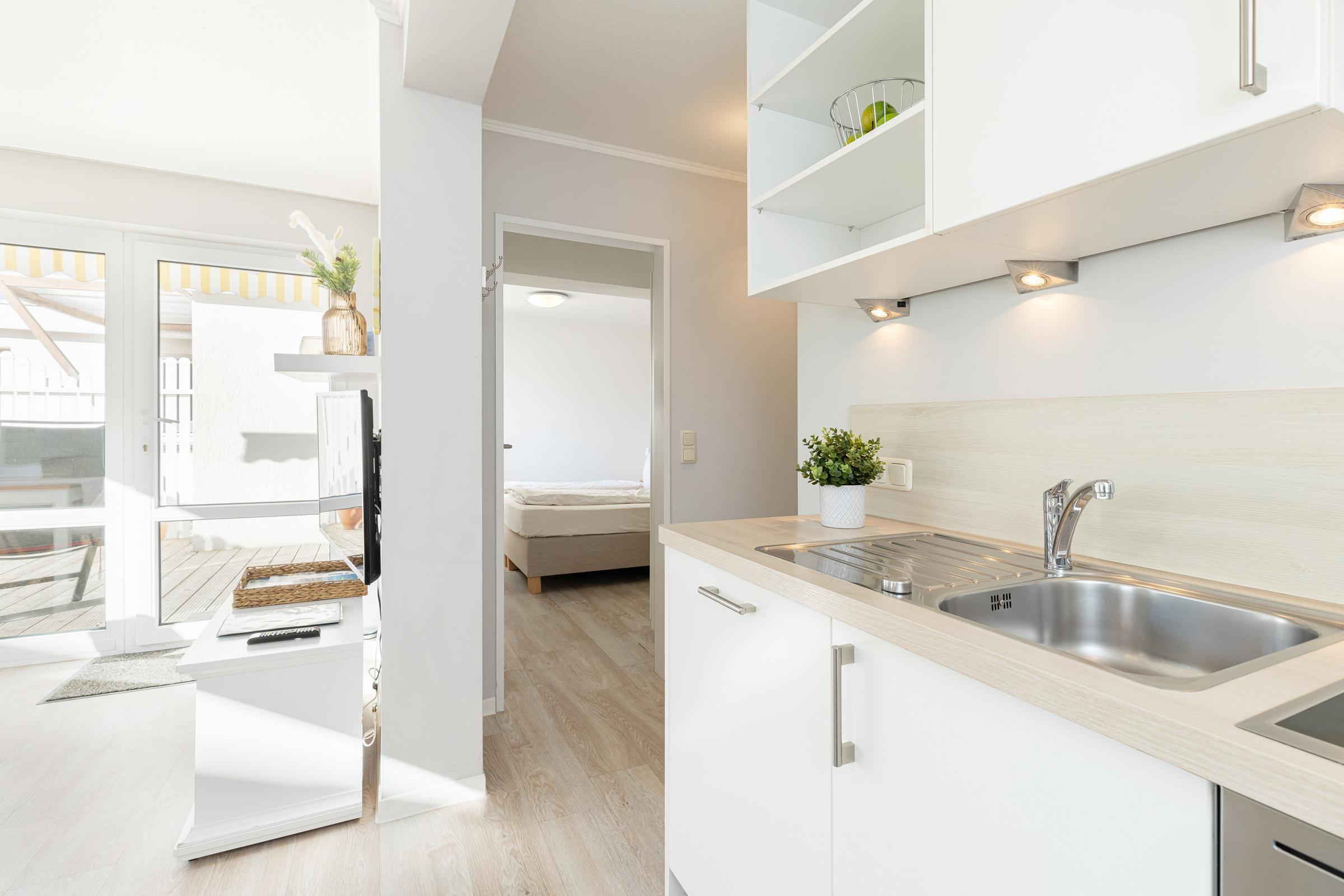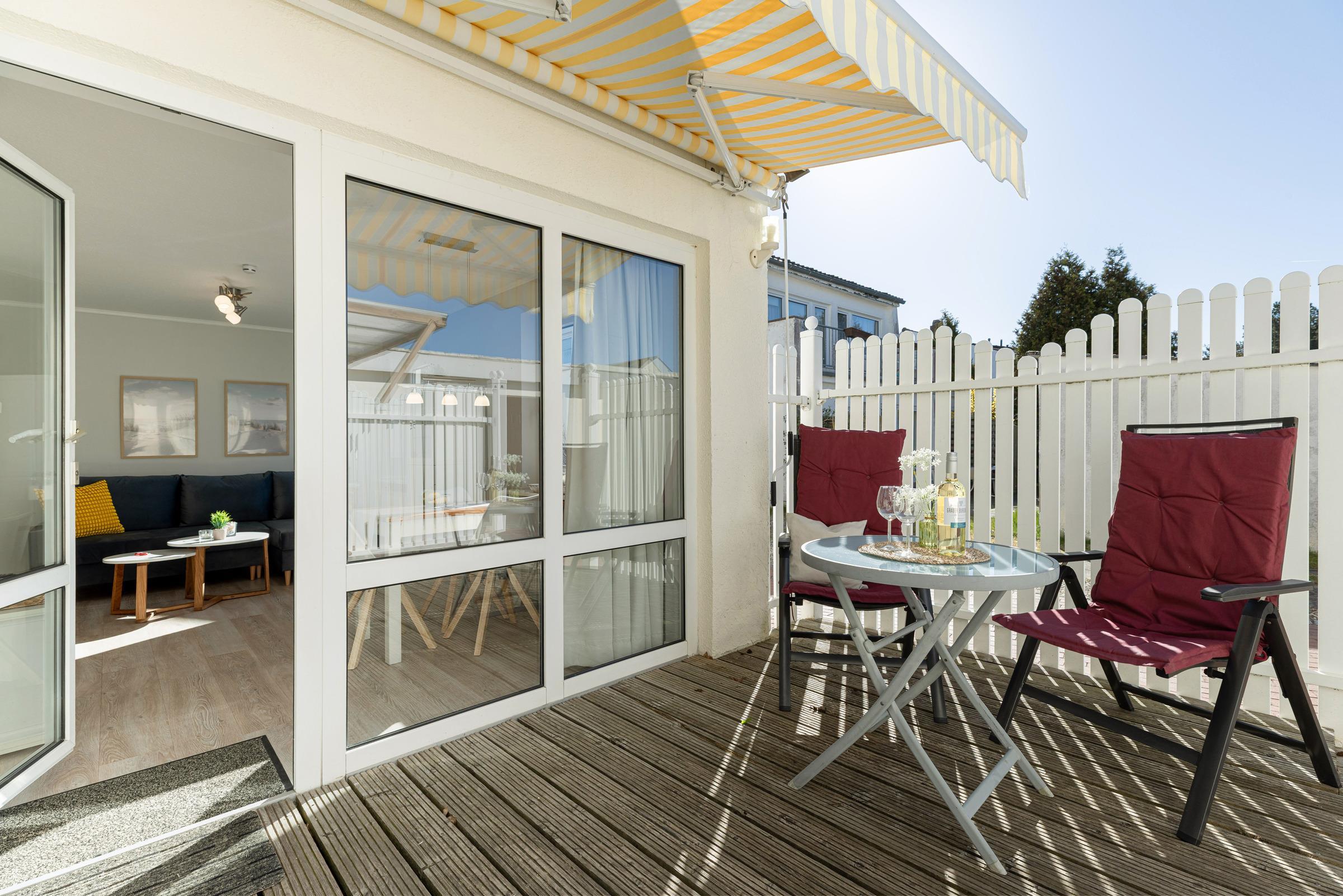 Versteckt, hinter einem weißen Lamellenzaun, liegt die ca. 9 qm große Terrasse mit Holzboden und Markise, über die Sie das ruhig gelegene Apartment für 2-3 Personen erreichen.