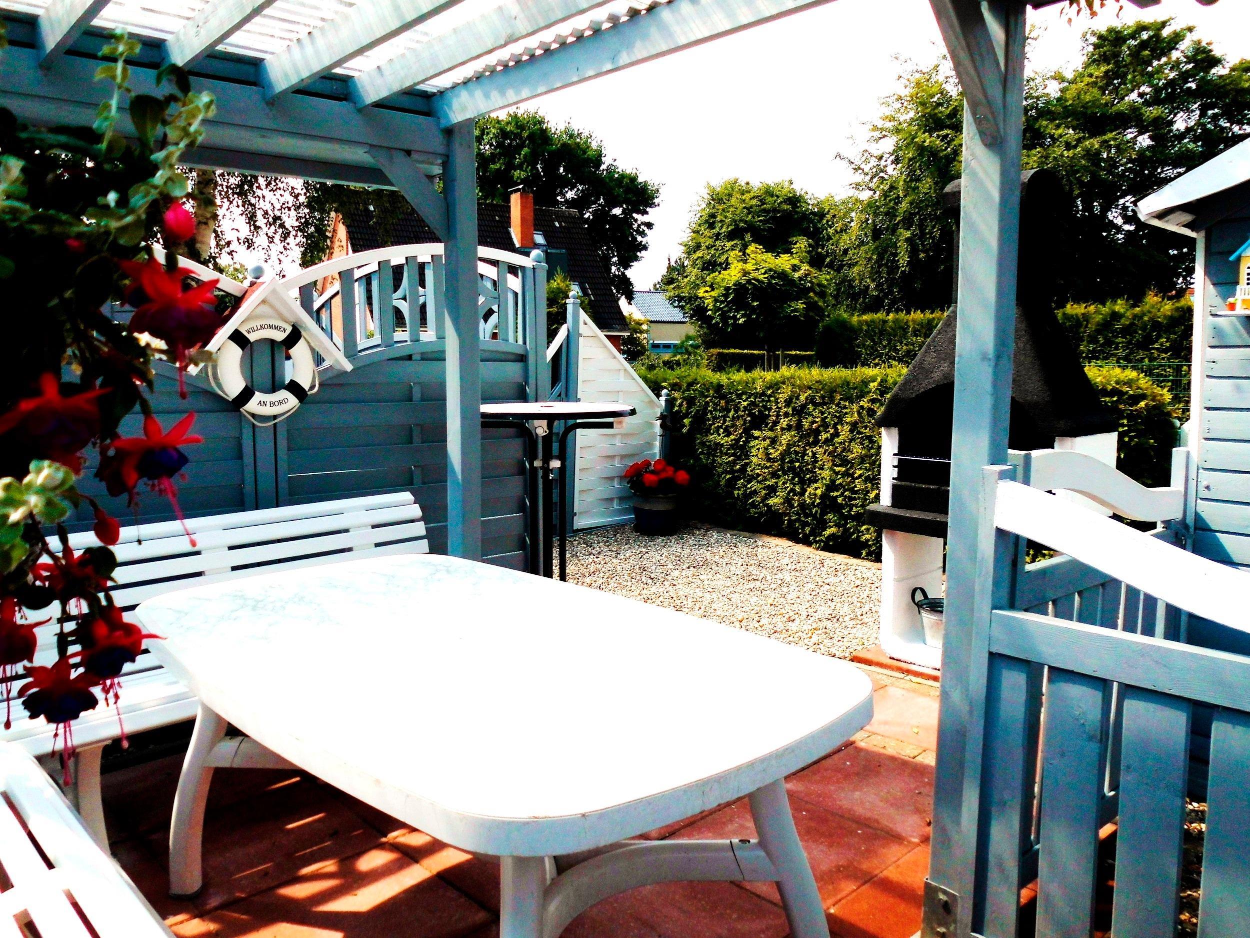 Vor dem Haus ist eine kleine Terrasse, wo bei gutem Wetter schon zum Frühstück die Sonne scheint. Für alle unsere Hausgäste steht außerdem ein schöner Grillplatz mit überdachter Sitzecke und Grillkamin zur Verfügung. Dort können Sie einen schönen Urlaubstag ausklingen lassen und die Grömitzer Sonne bis zum Untergang genießen.