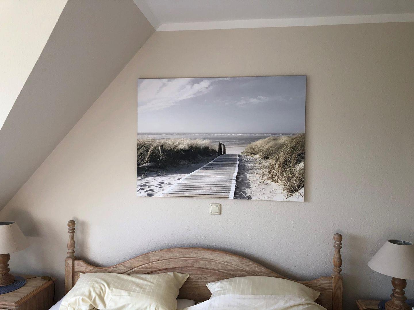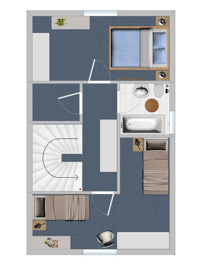 Auf 3 Etagen verteilt finden Sie 1 Schlafzimmer mit einem Doppelbett und 1 Kinderzimmer mit 2 Einzelbetten.