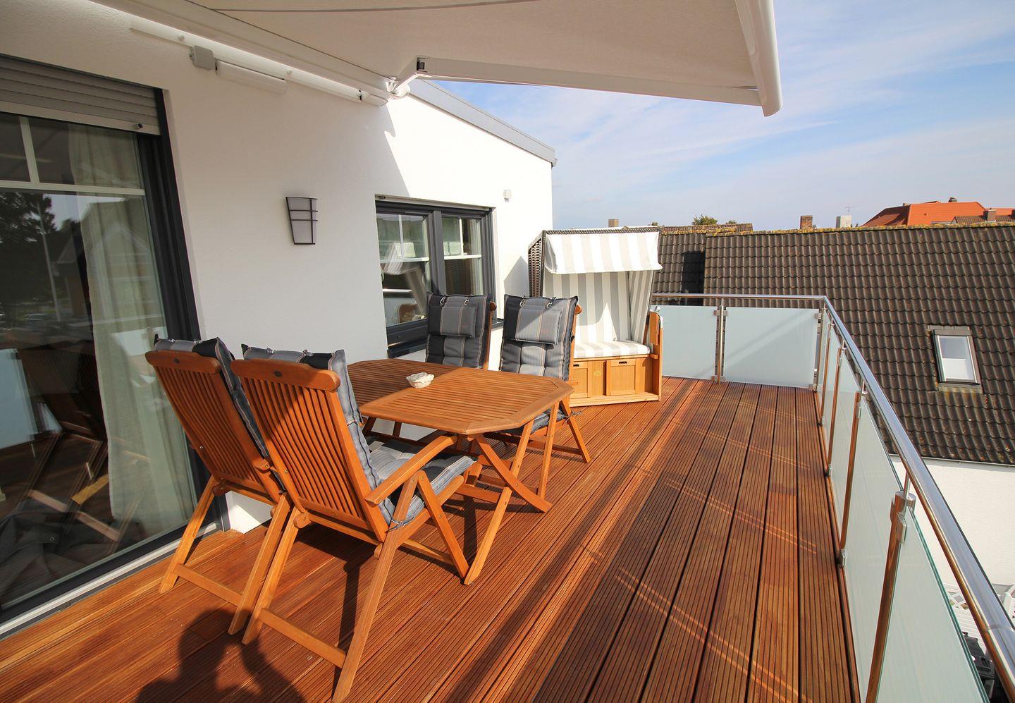 - Dachterrasse mit Gartenmöbeln, Strandkorb sowie 2 Sonnenliegen