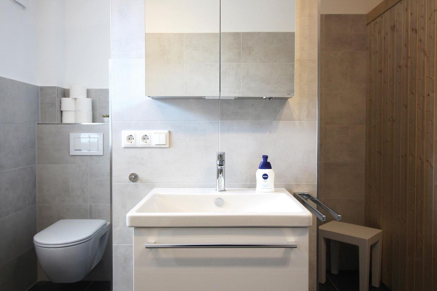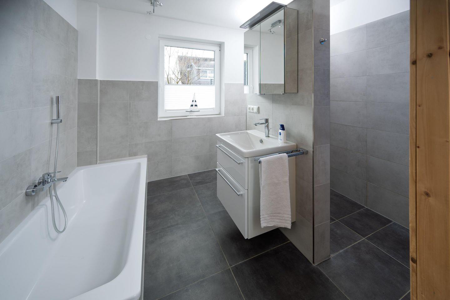 - Badezimmer mit bodengleicher Dusche, Badewanne & Sauna