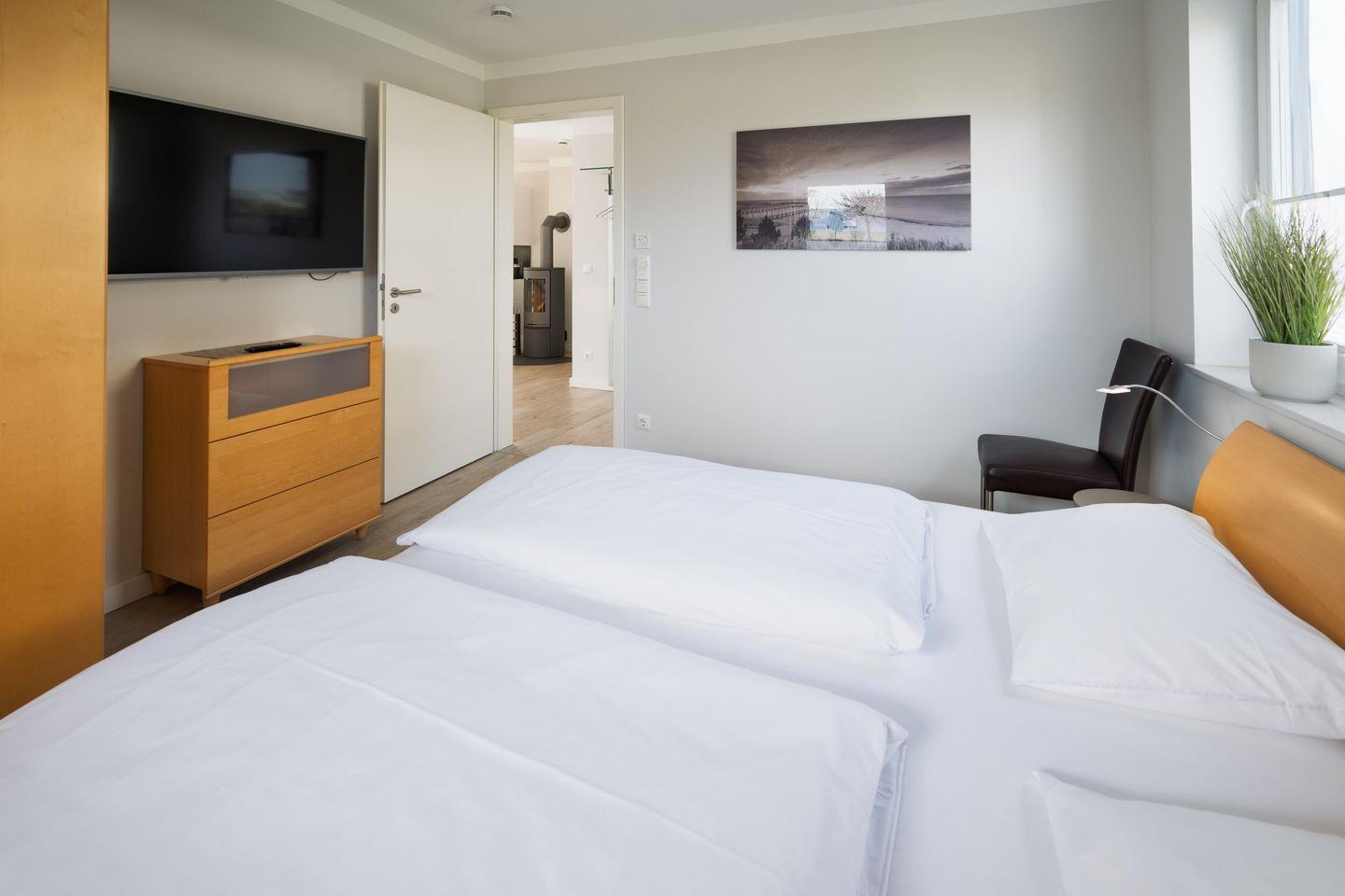 - Schlafzimmer mit Doppelbett und Smart-TV
