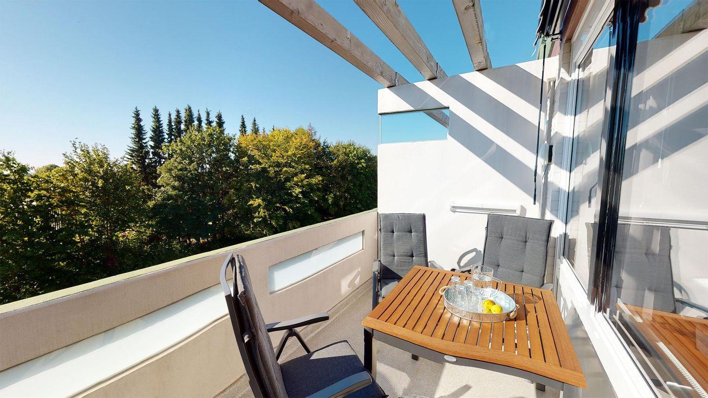 Genießen Sie die Sonne auf dem Balkon, der von einer Markise beschattet wird. Bequeme Balkonmöbel stehen für Sie bereit, und über die Baumkronen hinweg können Sie die Ostsee sehen!