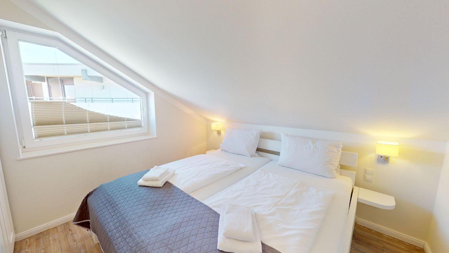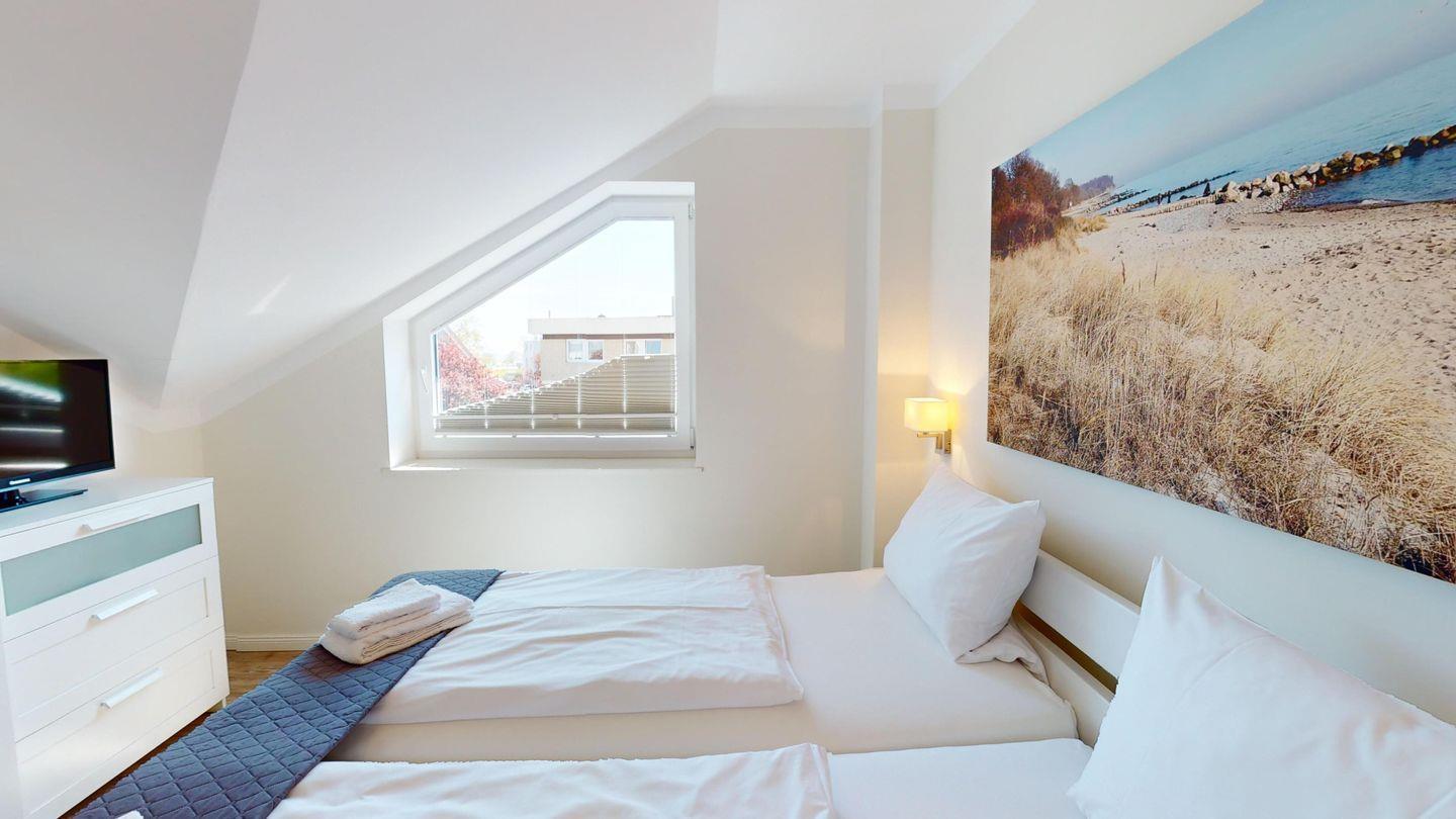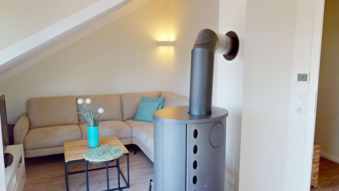 Wie gemütlich! Diese schöne, moderne Ferienwohnung mit Dachschrägen in Strandnähe bietet auf 80 qm drei Schlafzimmer, zwei Bäder, ein Wohnzimmer mit Kamin und offener Küche sowie einen Balkon und ist perfekt geeignet für bis zu 6 Personen.