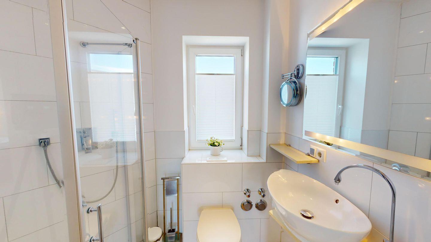 Eins der Bäder ist ein Duschbad, das zweite Bad hat eine Badewanne. Beide Bäder sind mit großen beleuchteten Wand- und Kosmetikspiegeln, ausgestattet.