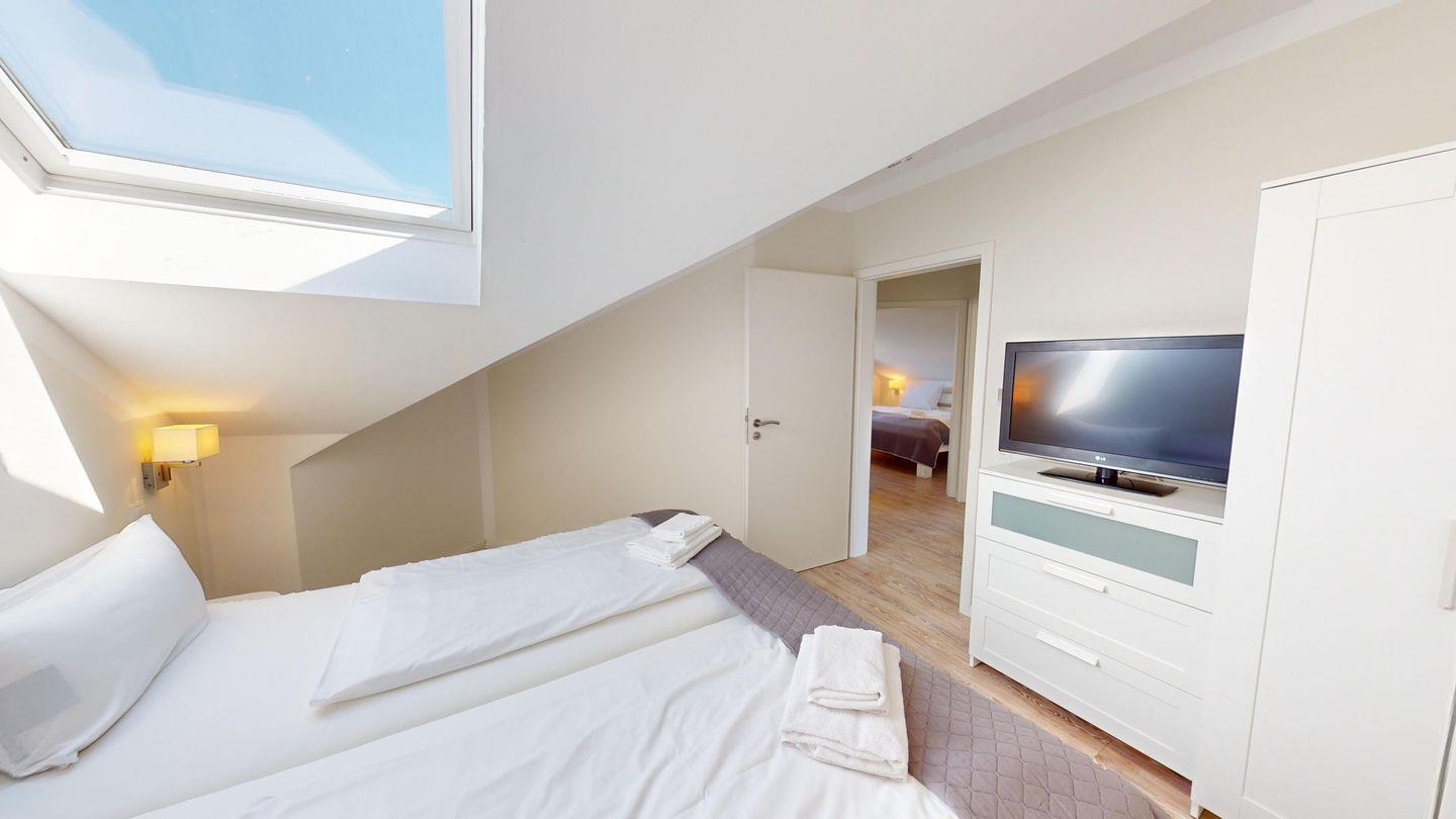 Die Liegefläche der hochwertigen Betten ist besonders groß (2 x 2 m). Alle Schlafzimmer sind mit Verdunklungsplissees ausgestattet und verfügen über Flachbild-Fernseher.