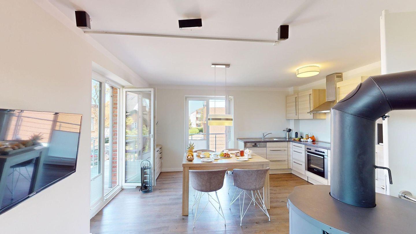 Im Wohn- und Esszimmer finden Sie eine offene Küche, einen Essplatz und eine gemütliche Sofaecke mit Kaminofen vor.