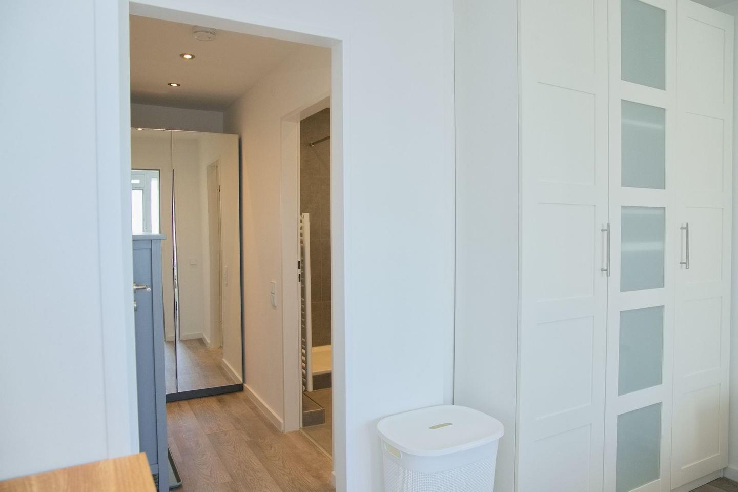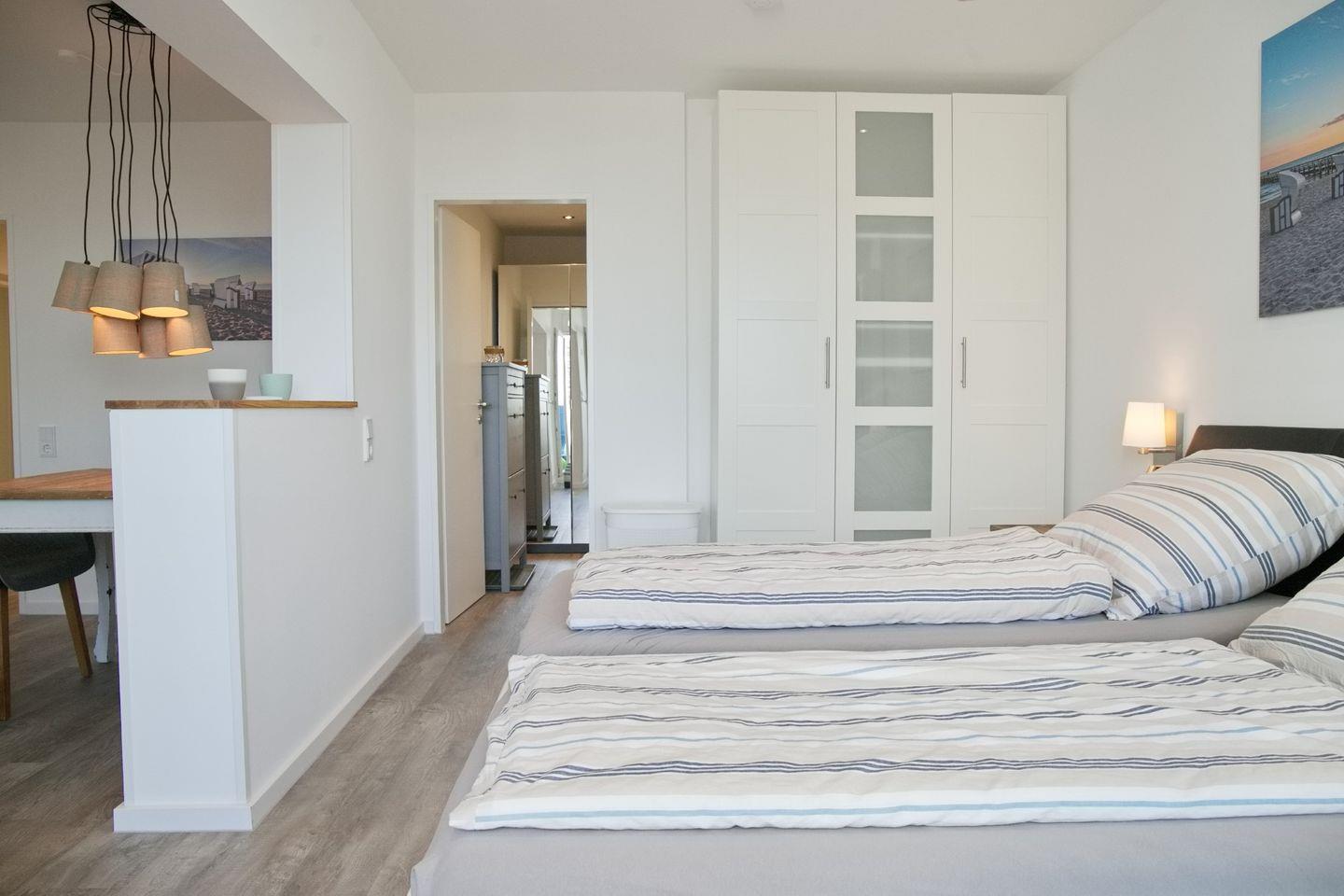 Der offene Schlafbereich ist geschmackvoll gestaltet und mit einem komfortablen Doppelbett ausgestattet, das Ihnen eine erholsame Nachtruhe garantiert. Ein geräumiger Kleiderschrank bietet ausreichend Platz für Ihre Kleidung und persönlichen Gegenstände.