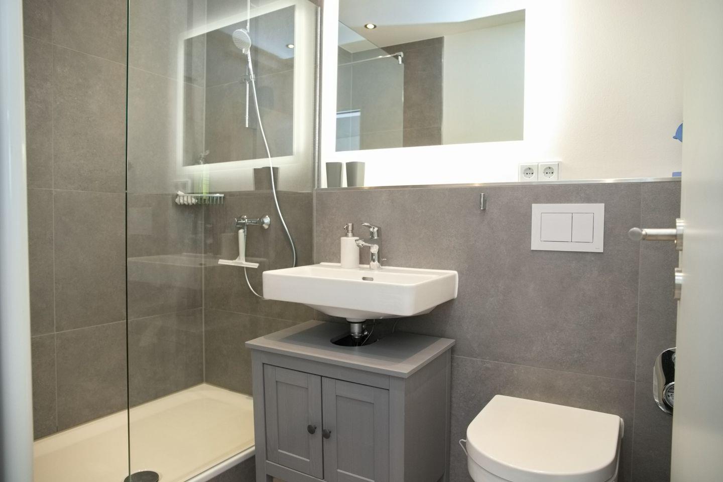 Das geräumige Badezimmer bietet Ihnen allen Komfort, den Sie benötigen. Eine Dusche mit großem, fast bodengleichem Einstieg ermöglicht einen bequemen Zugang, während das Waschbecken mit Unterschrank und die Toilette moderne Annehmlichkeiten bieten.