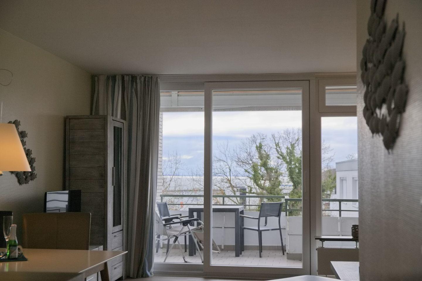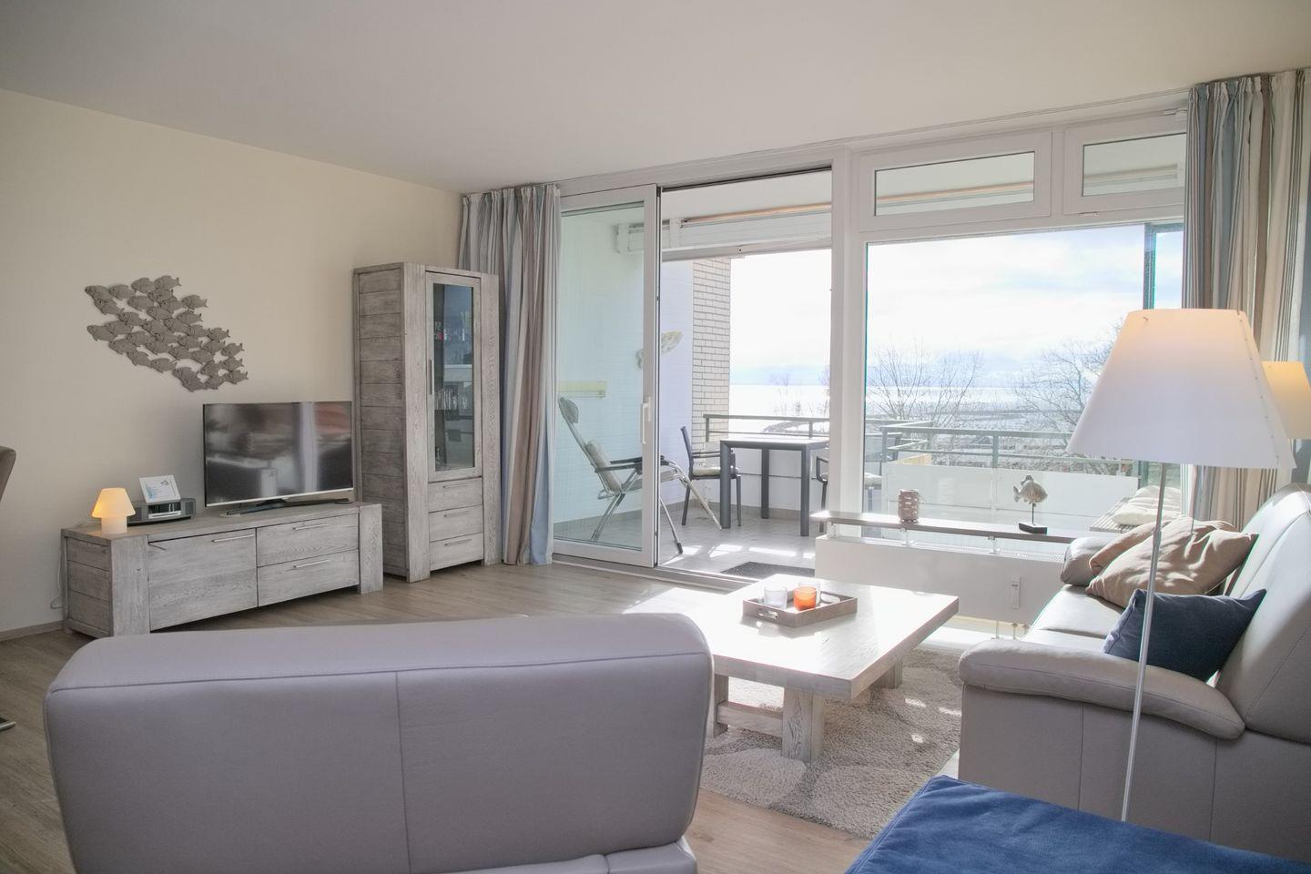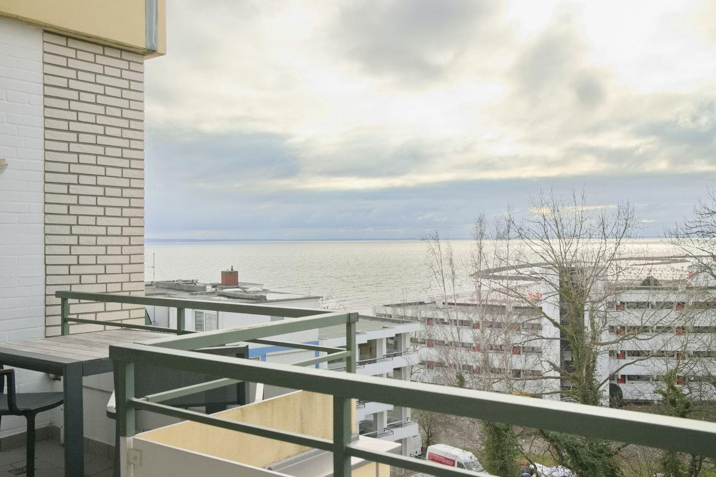 Moderne lichtdurchflutete Ferienwohnung mit möblierten Süd- Westbalkon mit Markise und Seeblick in erster Reiher direkt an der Promenade.