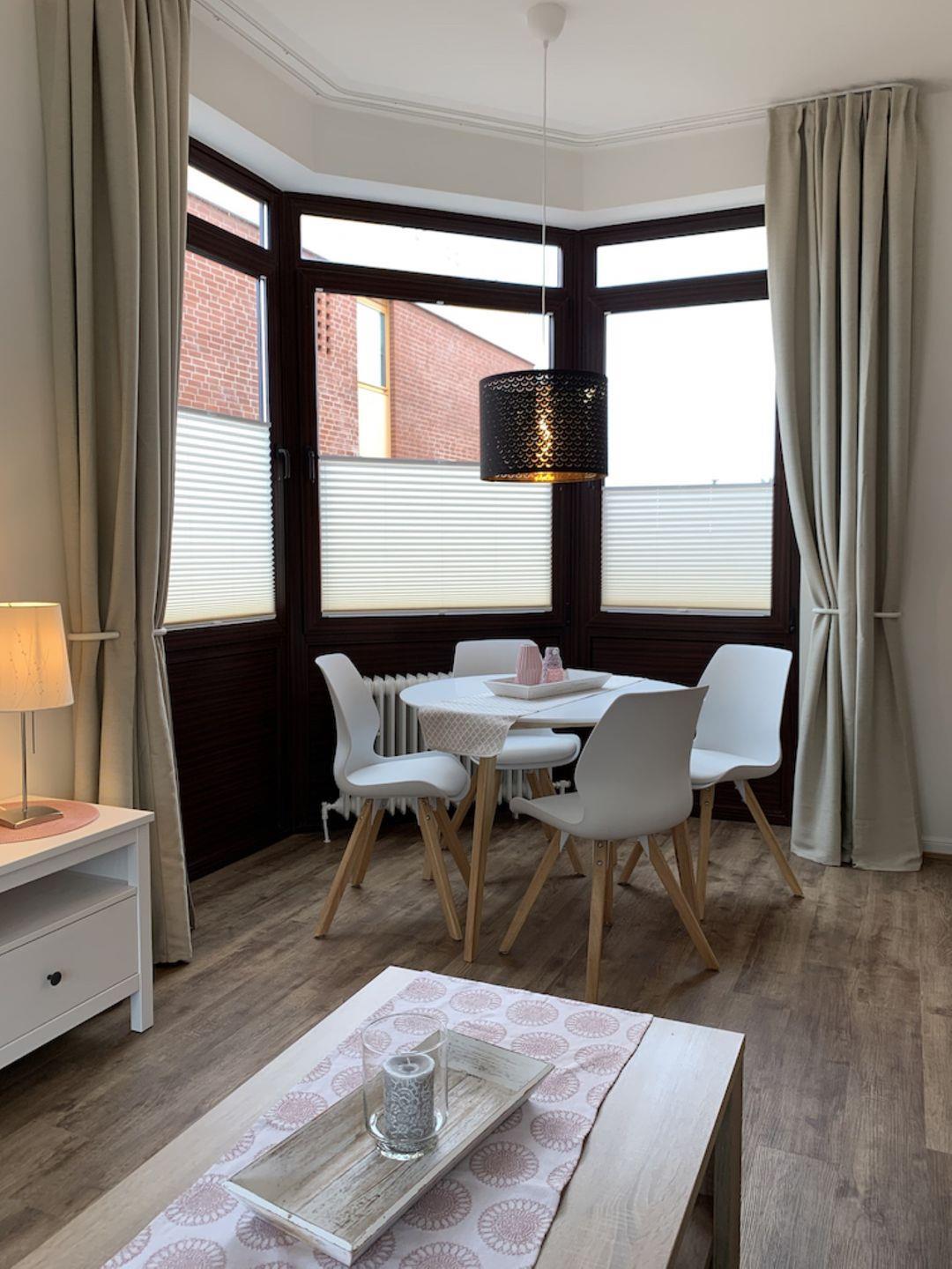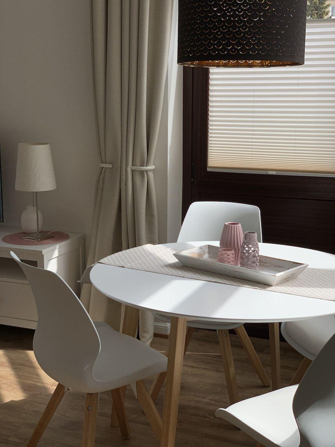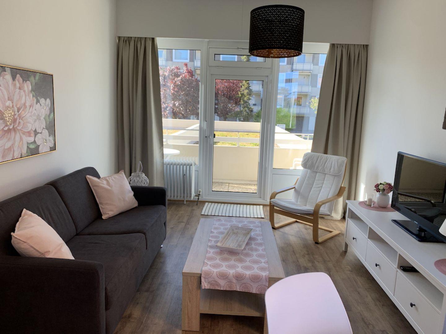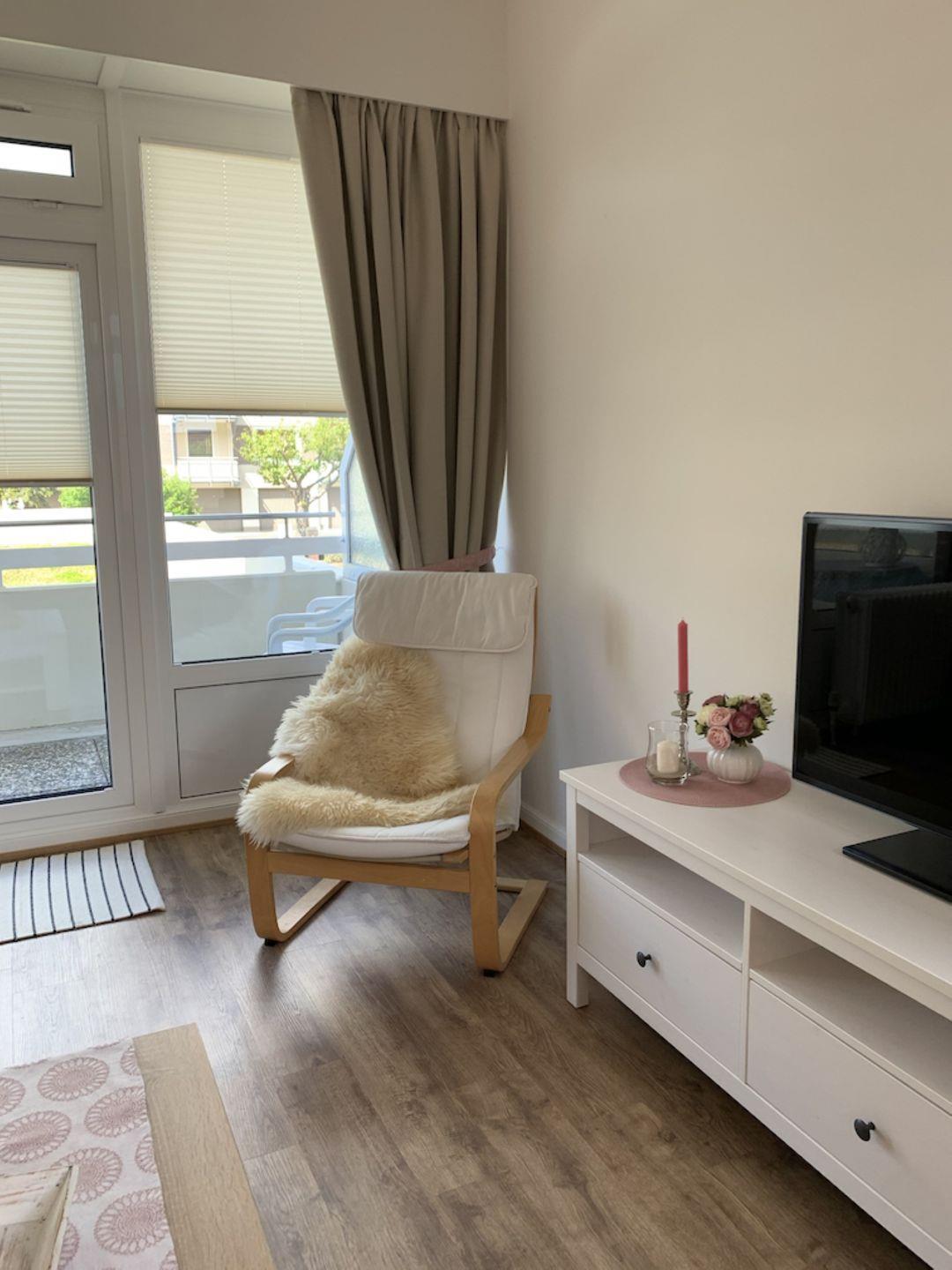 Der kombinierte Wohn- und Essbereich ist der Mittelpunkt dieser Wohnung. Auf der gemütlichen Schlafcouch (hier finden 2 Personen Platz) und dem Schwingstuhl können Sie schöne Abende mit der Familie verbringen. Vom Wohnzimmer aus gelangen Sie auf den möblierten Balkon in Nordlage. Hier genießen Sie die Sonne ab ca. 15 Uhr bis in die Abendstunden.