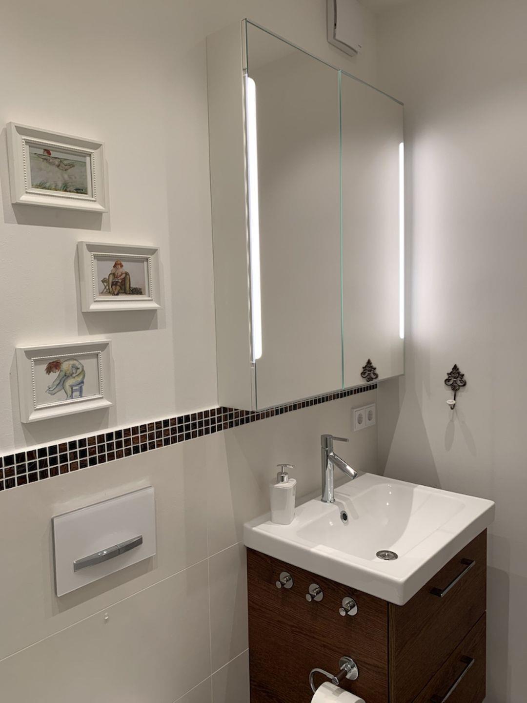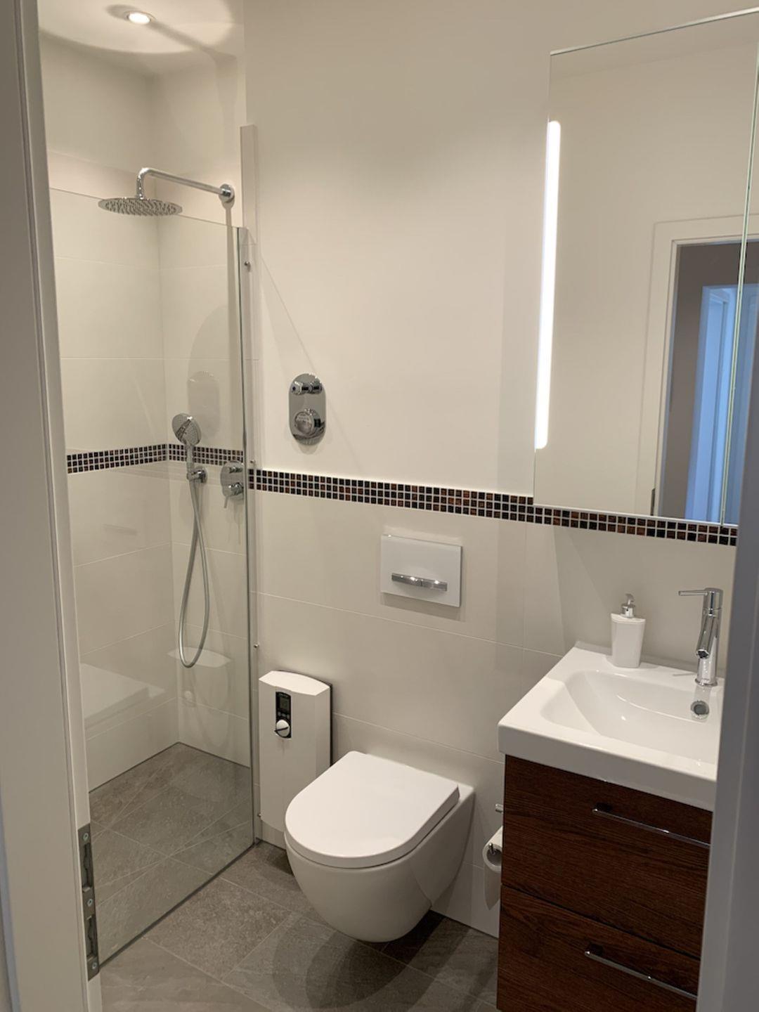 Zu Ihrer rechten betreten Sie das hochwertige Duschbad mit ebenerdiger Dusche und Rainshower, wandhängendes WC sowie einen Waschtisch und einen beleuchteten Spiegelschrank für Ihre Kosmetika.