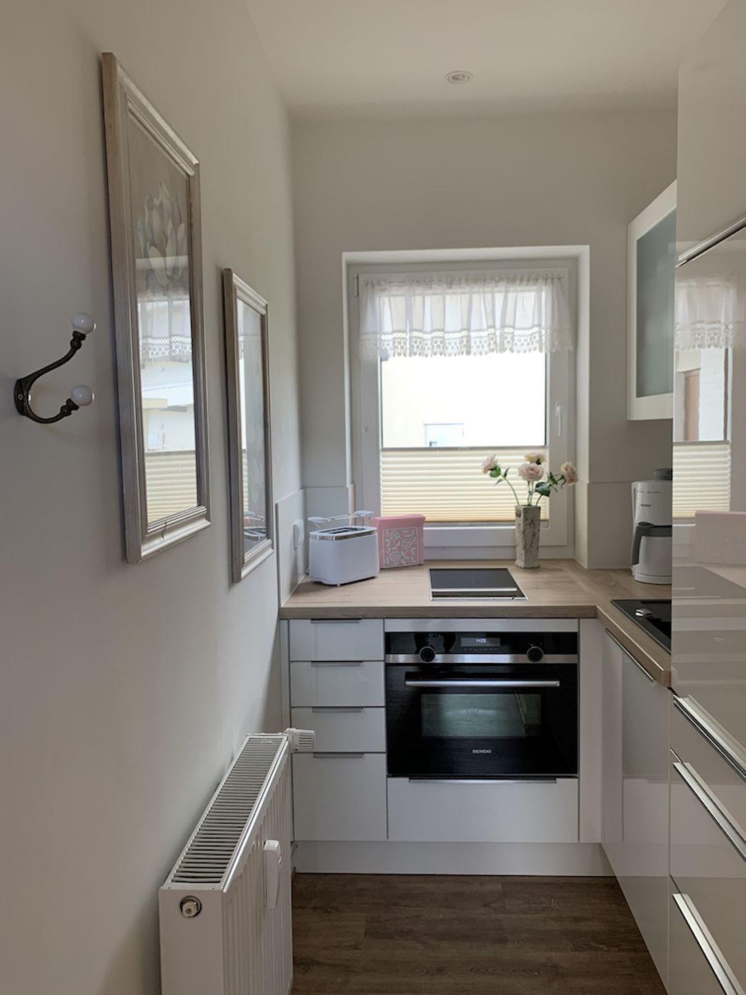 Von der Diele kommen Sie weiter in die Einbauküche. Hier finden Sie neben einem 2er Induktionskochfeld, einen Backofen mit Mikrowellenfunktion, einen Kühlschrank mit ***Gefrierfach, eine Kaffeemaschine, einen Toaster und einen Wasserkocher.