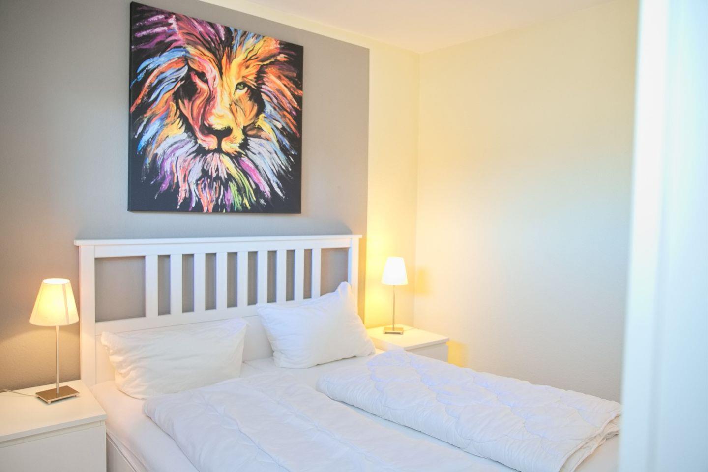 Zu Ihrer Linken befindet sich das separate Schlafzimmer. Dieses ist durch zwei Türen zu begehen. Ausgestattet ist es mit einem Doppelbett (2x80x190 cm) und Nachttischen.