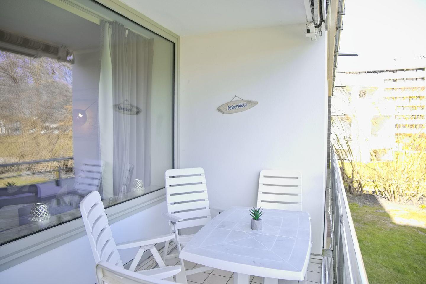 Der möblierte Südbalkon ist vom Wohnzimmer aus zu begehen. Eine Markise bietet Schutz. Genießen Sie die Sonnenstrahlen und entspannen beim herrlichen Blick über die Wiesen auf das Meer.