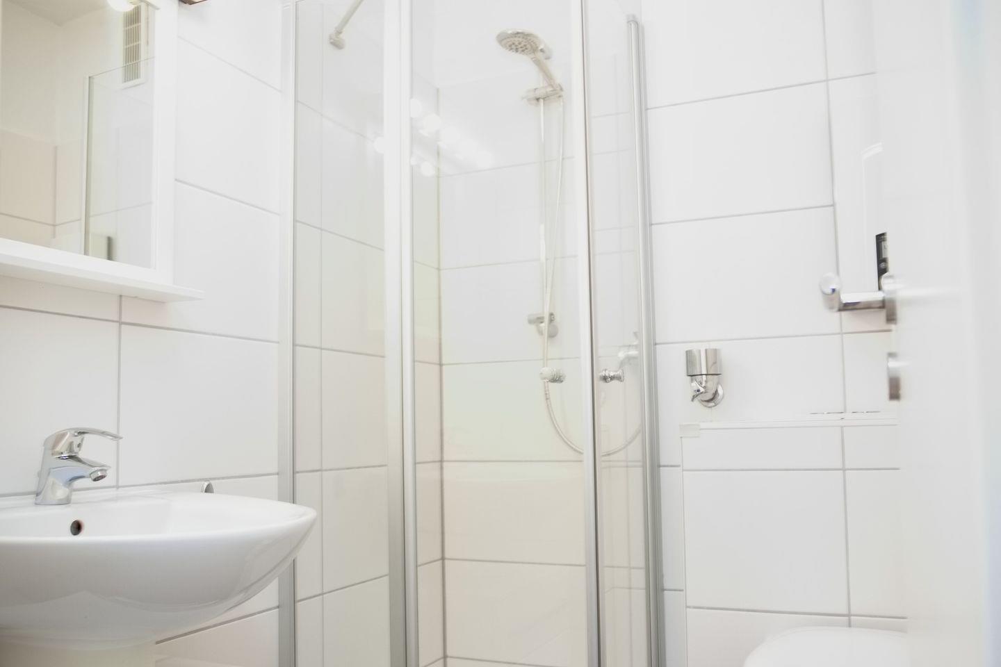 Zurück auf den Flur geht es weiter in das moderne Duschbad mit Waschtisch, WC, Spiegel und Handtuchheizung.