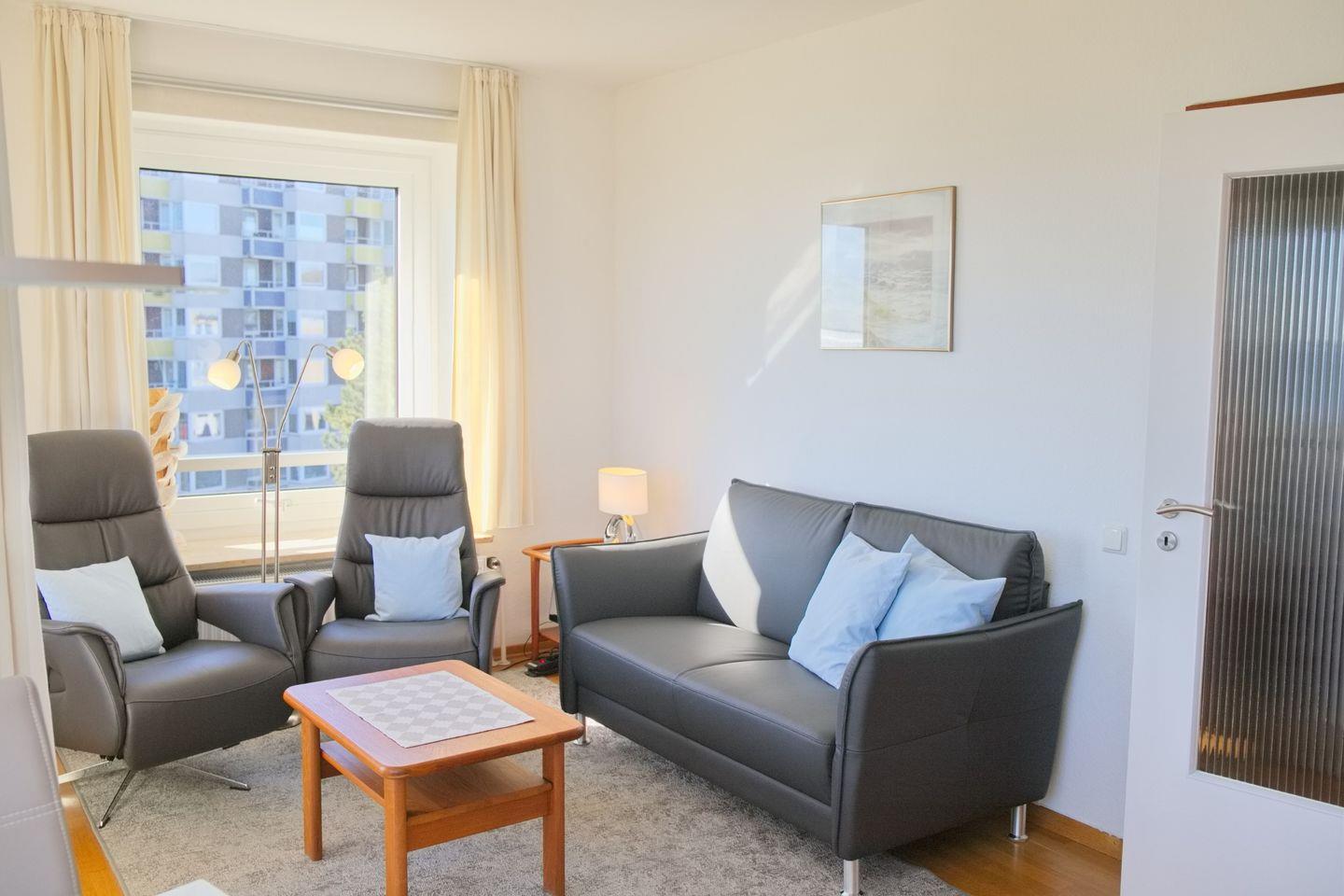 Das Wohnzimmer besticht mit dem herrlichen Panoramablick und bietet Ihnen zwei Ledersessel und eine Couch. Ein Flach TV und ein Radio mit CD Player stehen zur Unterhaltung bereit. Der Essbereich steht direkt vor der Fensterfront und bietet ausreichend Platz.