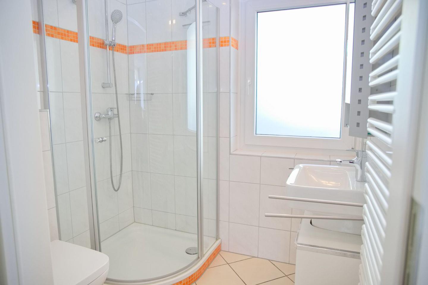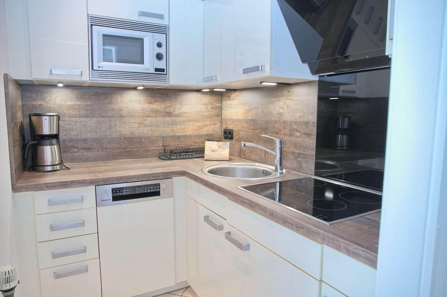 Die zeitgemäße Küche, die über einen Herd mit Ceranfeld, eine Spülmaschine, eine Mikrowelle, einen Kühlschrank mit Gefrierfach sowie alle nötigen Küchenutensilien verfügt, lässt keine Wünsche offen. Auch eine Kaffeemaschine, ein Wasserkocher und ein Toaster stehen für Ihre täglichen Bedürfnisse bereit. Das Bad ist mit einer Dusche ausgestattet und bietet Ihnen den nötigen Komfort.