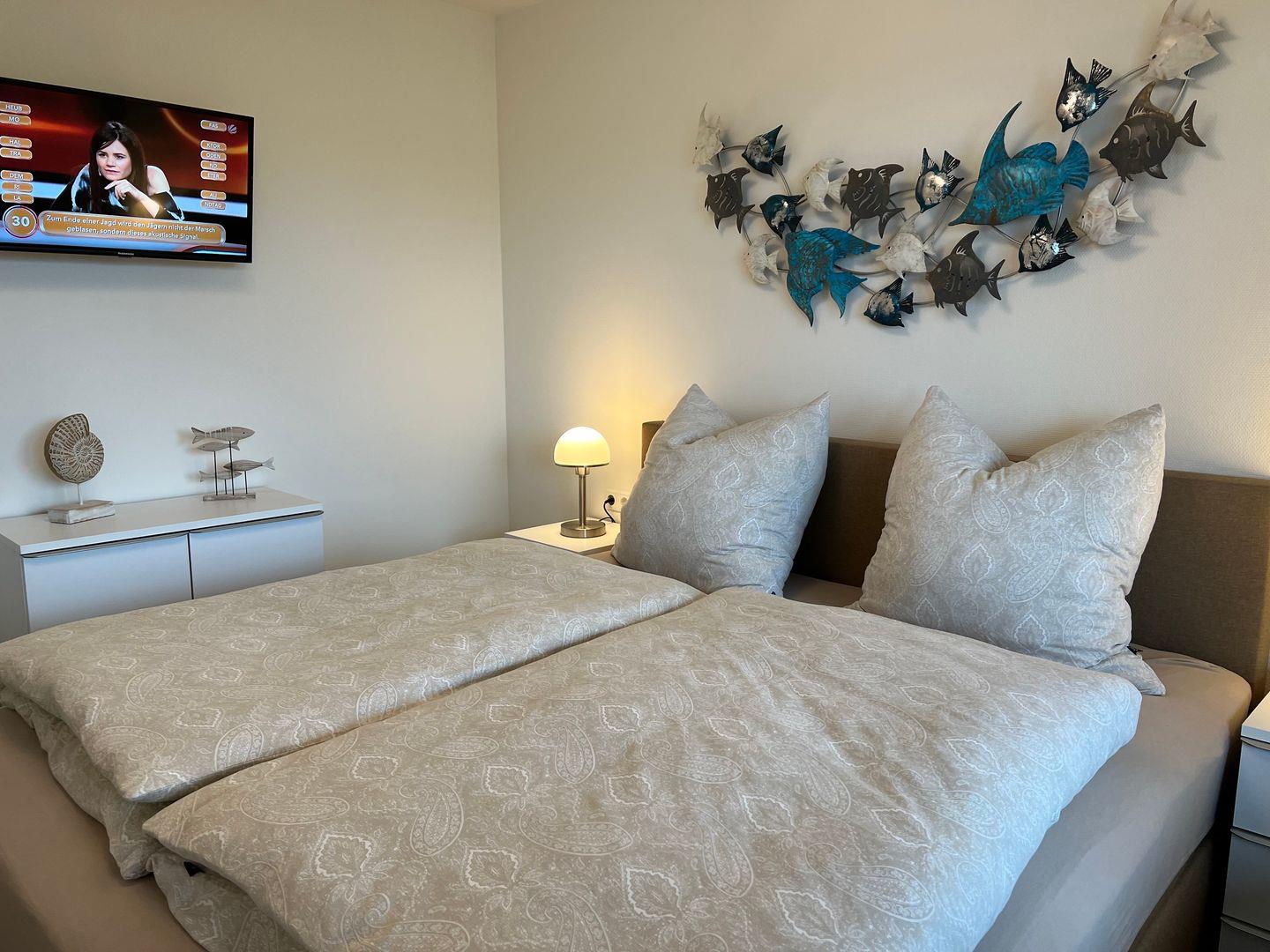 Auf gleicher Ebene befinden sich zwei lichtdurchflutete Schlafzimmer mit Boxspringbett(180x200 cm durchgehender Topper), Schiebetürenkleiderschrank und Flatscreen-TV. Von beiden Schlafzimmern sowie vom Wohnzimmer haben Sie Zugang zum überdachten Balkon. Im Bad erwartet Sie eine bodengleiche Dusche mit WC, Waschtisch und eigener Sauna. Ein Gäste- WC finden Sie ebenfalls vor.