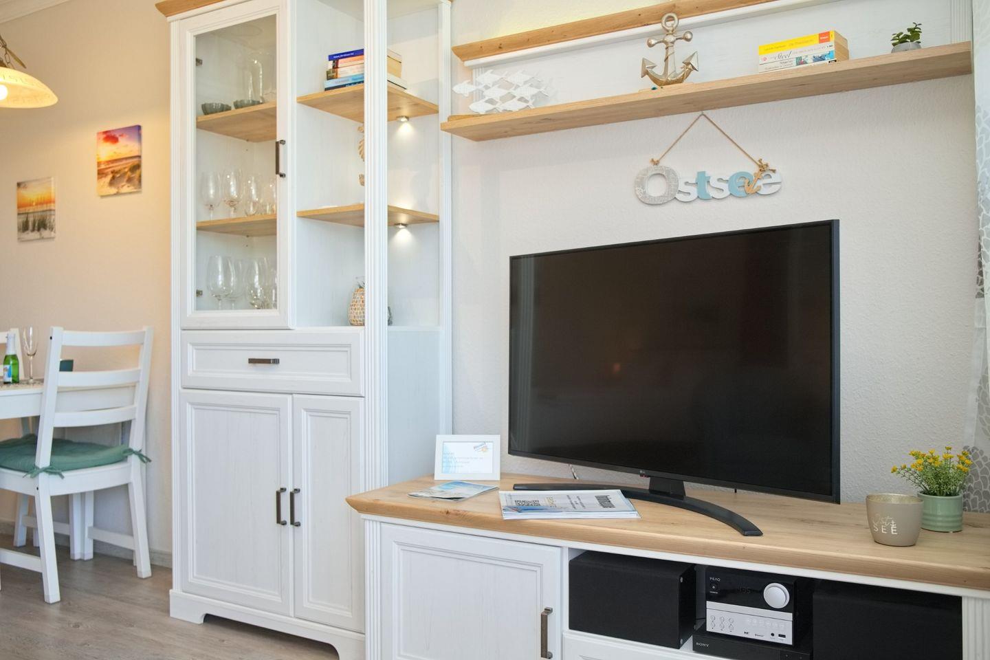 Die Villa am Meer App. 65 erstreckt sich über 43 m² im 3. Stock eines modernen Gebäudes, das mit einem Aufzug erreichbar ist. Die geschmackvoll gestaltete Wohnung ist sowohl für Paare als auch für Familien geeignet und bietet komfortabel Platz für bis zu vier Personen. Der helle Wohnbereich ist offen gestaltet und umfasst eine gemütliche Sofaecke, einen Essbereich mit einem Esstisch sowie eine moderne, voll ausgestattete Küchenzeile. Hier finden Sie alles, was Sie für die Zubereitung köstlicher Mahlzeiten benötigen, darunter einen Ceran-Herd, Backofen auf Augenhöhe, Kühlschrank mit Gefrierfach, Kaffeemaschine, Toaster und Wasserkocher.
