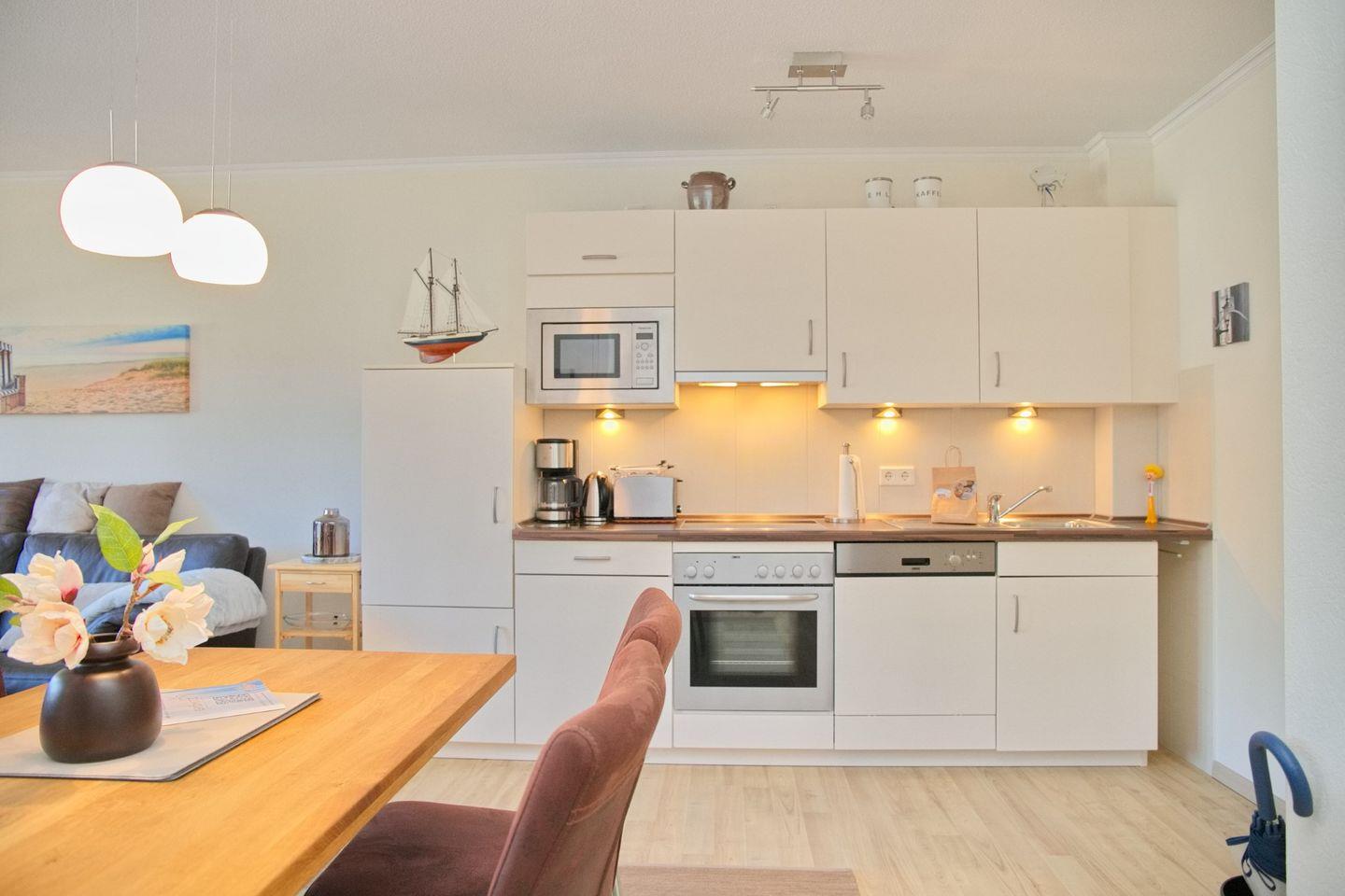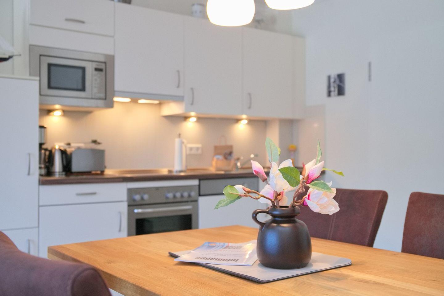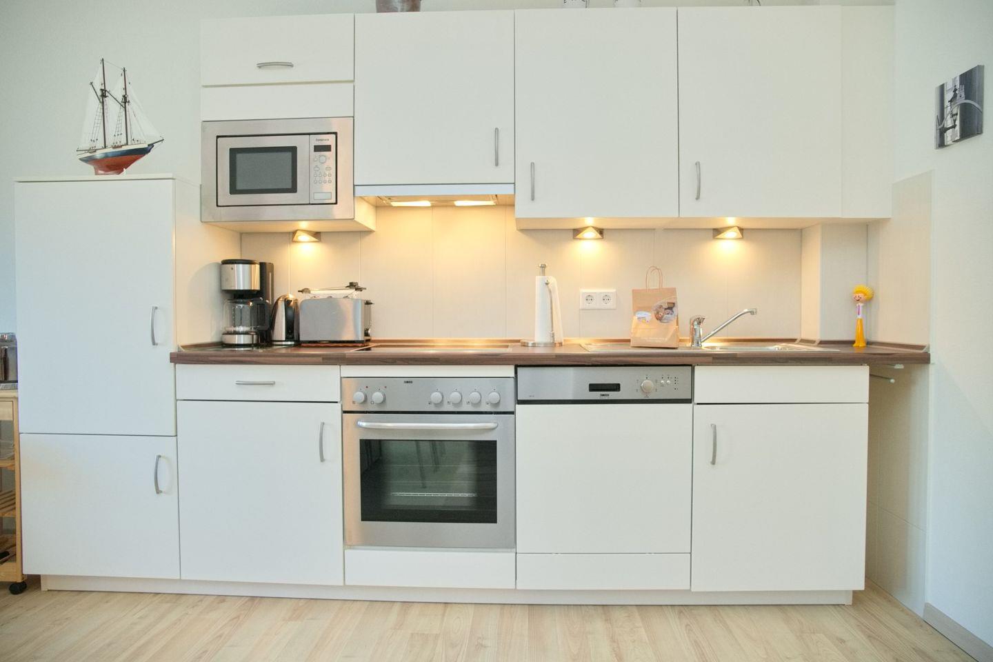 In der voll ausgestatteten Küche finden Sie alles, was das Herz begehrt: ein Cerankochfeld, einen Backofen, ein Gefrierfach, einen Geschirrspüler, eine Kaffeemaschine, einen Kühlschrank, eine Mikrowelle, einen Wasserkocher und einen Toaster – ideal, um sich auch im Urlaub kulinarisch zu verwöhnen.