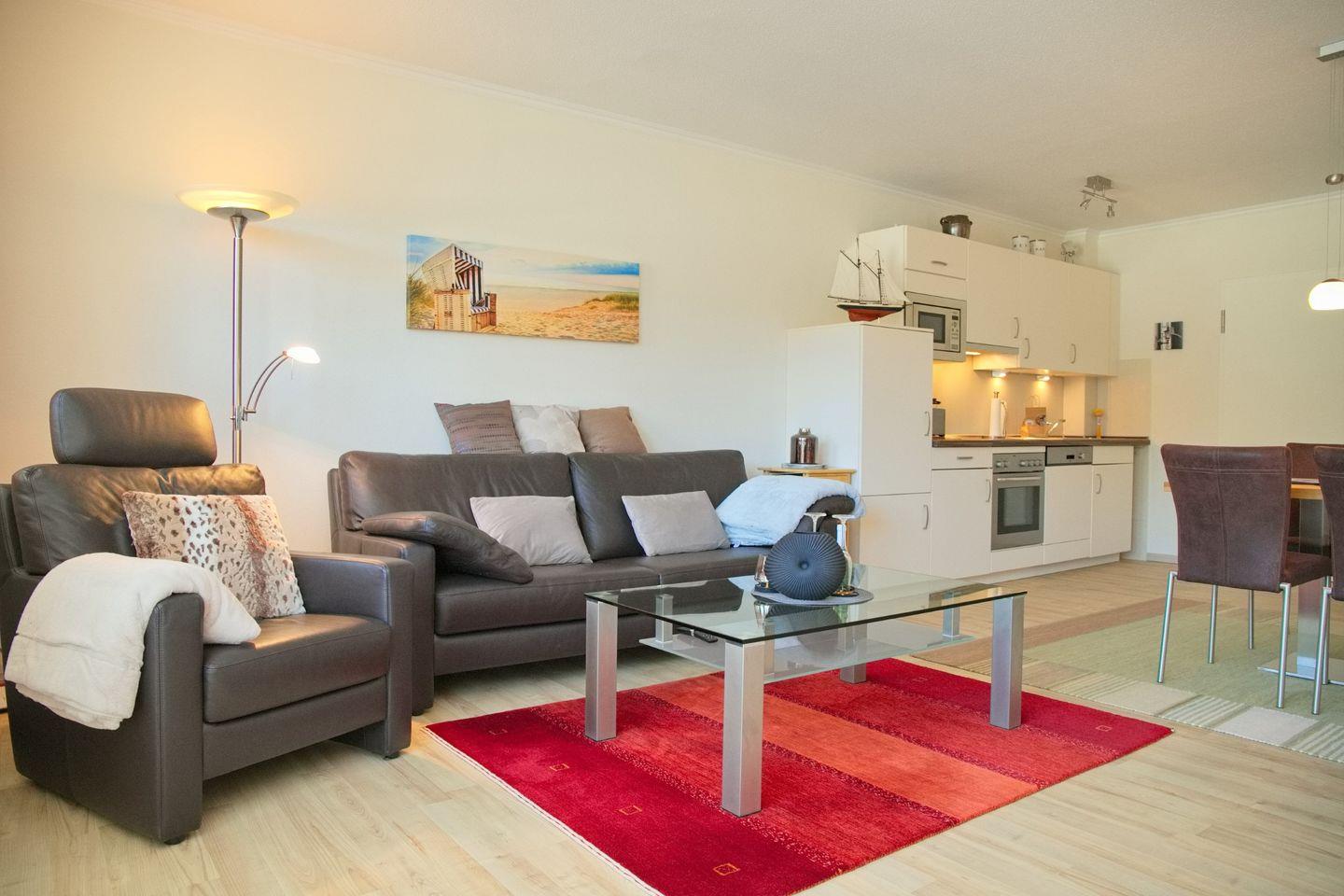 Das Wohnzimmer ist mit einer bequemen Leder-Couch, einem Sessel und einem Flachbild-TV ausgestattet, sodass Sie nach einem langen Strandtag bestens entspannen können. Der angrenzende Essbereich bietet Platz für 4 Personen und lädt zu gemeinsamen Mahlzeiten ein.