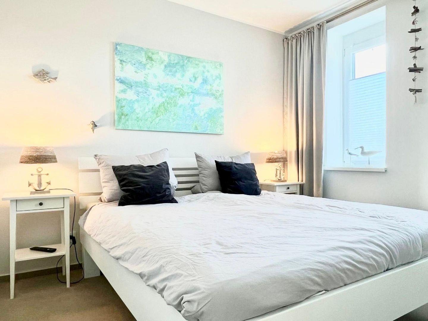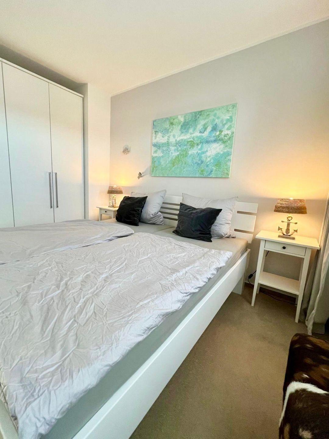 Das helle Schlafzimmer ist mit einem Doppelbett, einem großen Kleiderschrank und einen Flach TV eingerichtet.