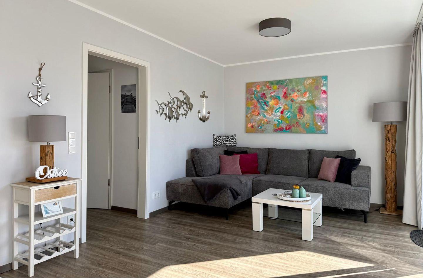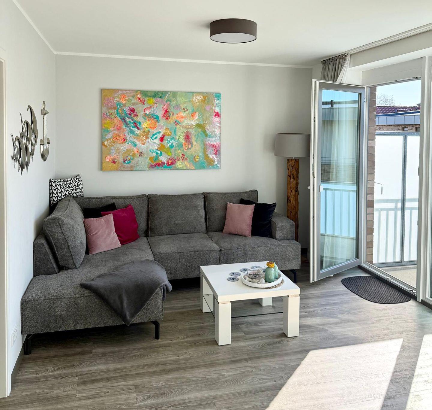 Der großzügige Wohnraum verfügt über eine gemütliche Couchecke mit Flach TV, einen schicken Essbereich sowie eine offen gestaltete Küche, die voll ausgestattet ist. Zaubern Sie sich in der Küche Ihr Urlaubsfrühstück und genießen Sie den Vormittag auf dem Balkon, der über den Wohnbereich zu erreichen ist. Eine Schatten spendende Markise stehet ihnen an den sonnigen Tagen zur Verfügung.