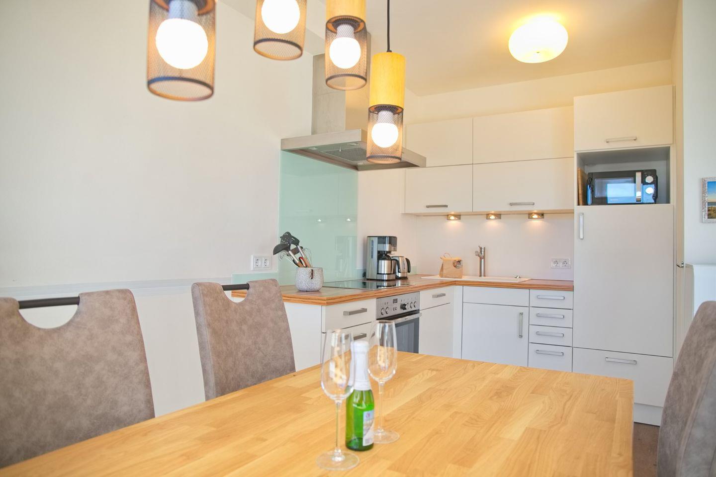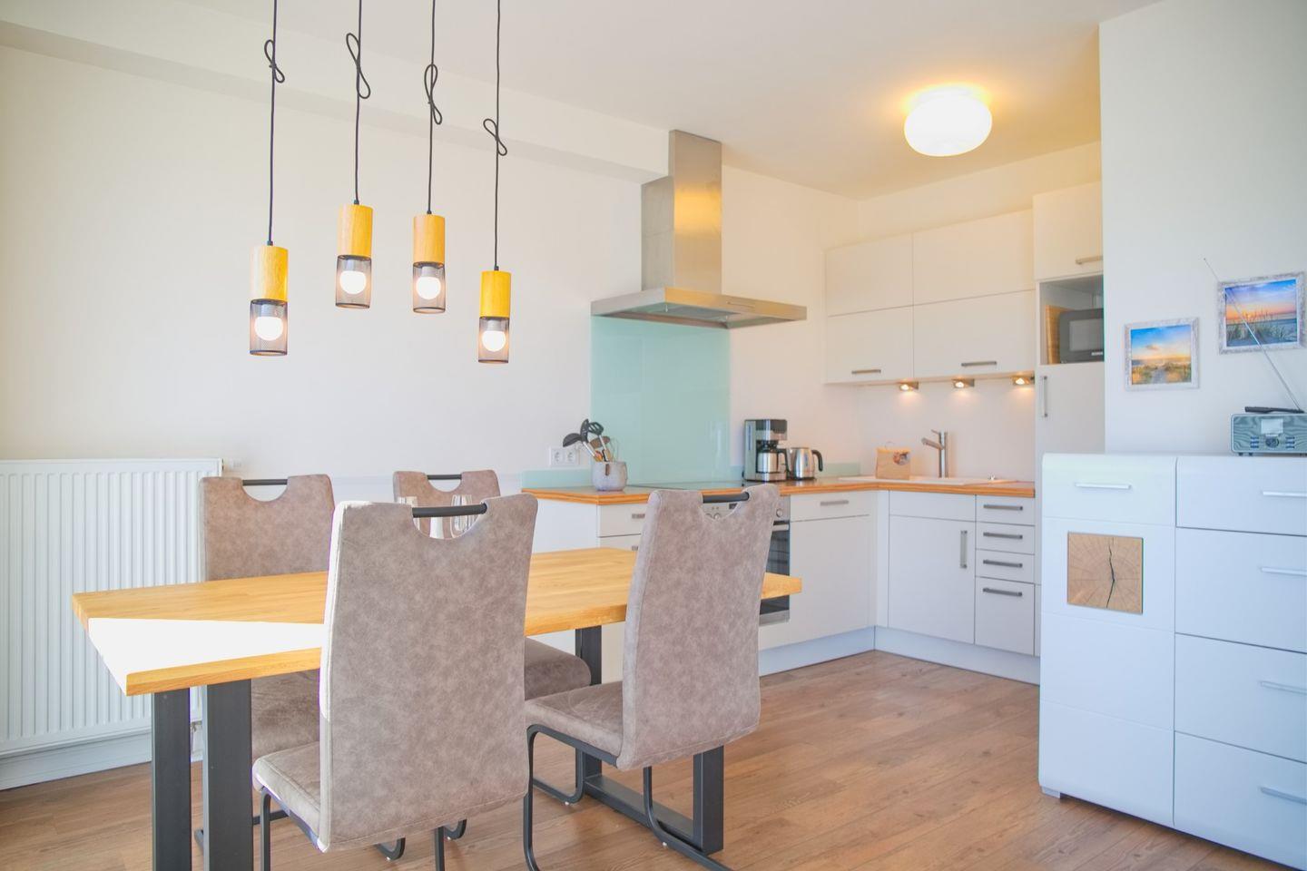 Die moderne, offene Küche ist zum Wohnzimmer hin ausgerichtet und lässt keine Wünsche offen. Sie ist mit einem Cerankochfeld, Backofen, Mikrowelle, Kühlschrank mit Gefrierfach, Spülmaschine, Wasserkocher, Toaster und einer Kaffeemaschine ausgestattet – ideal, um Ihre Lieblingsgerichte zuzubereiten.