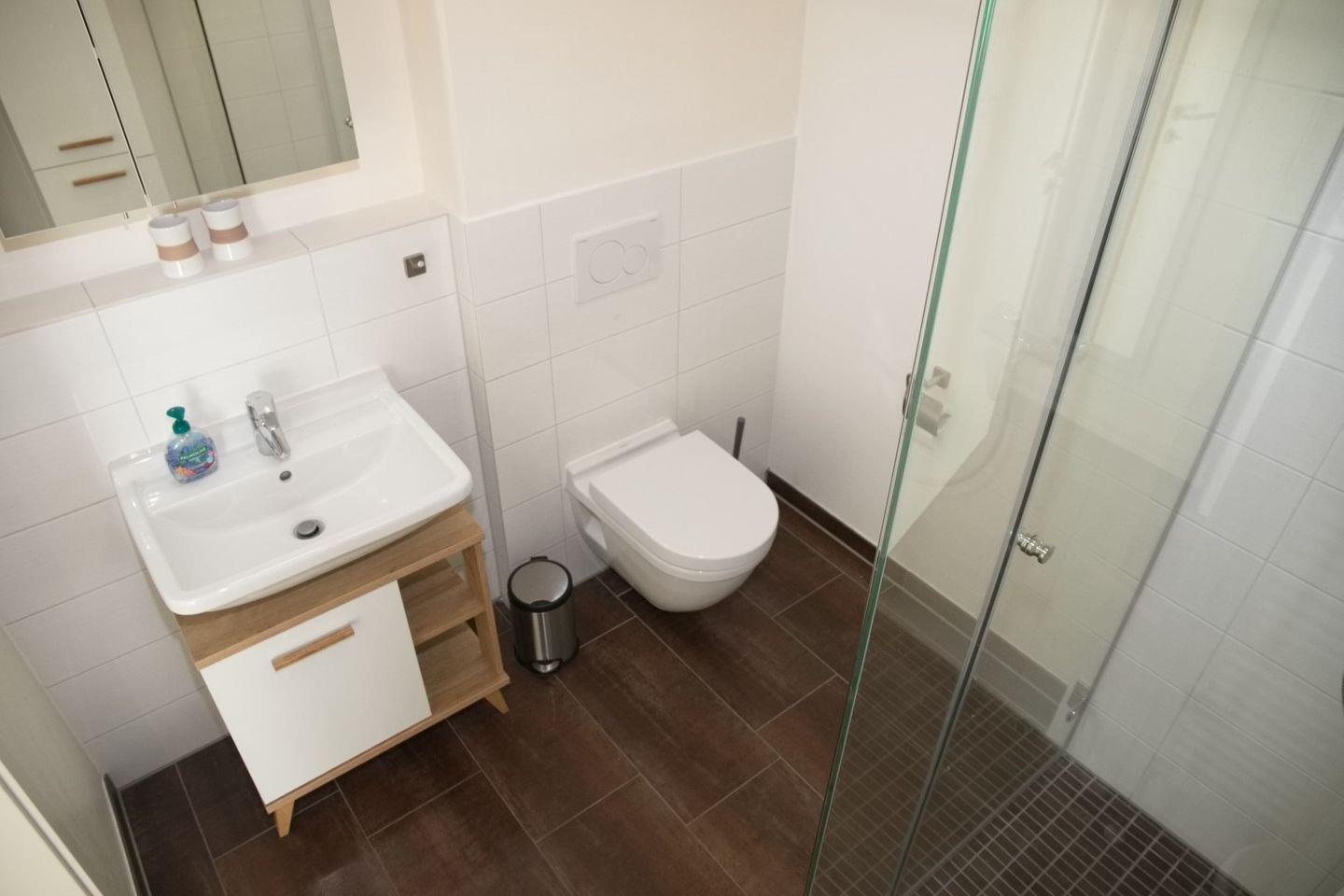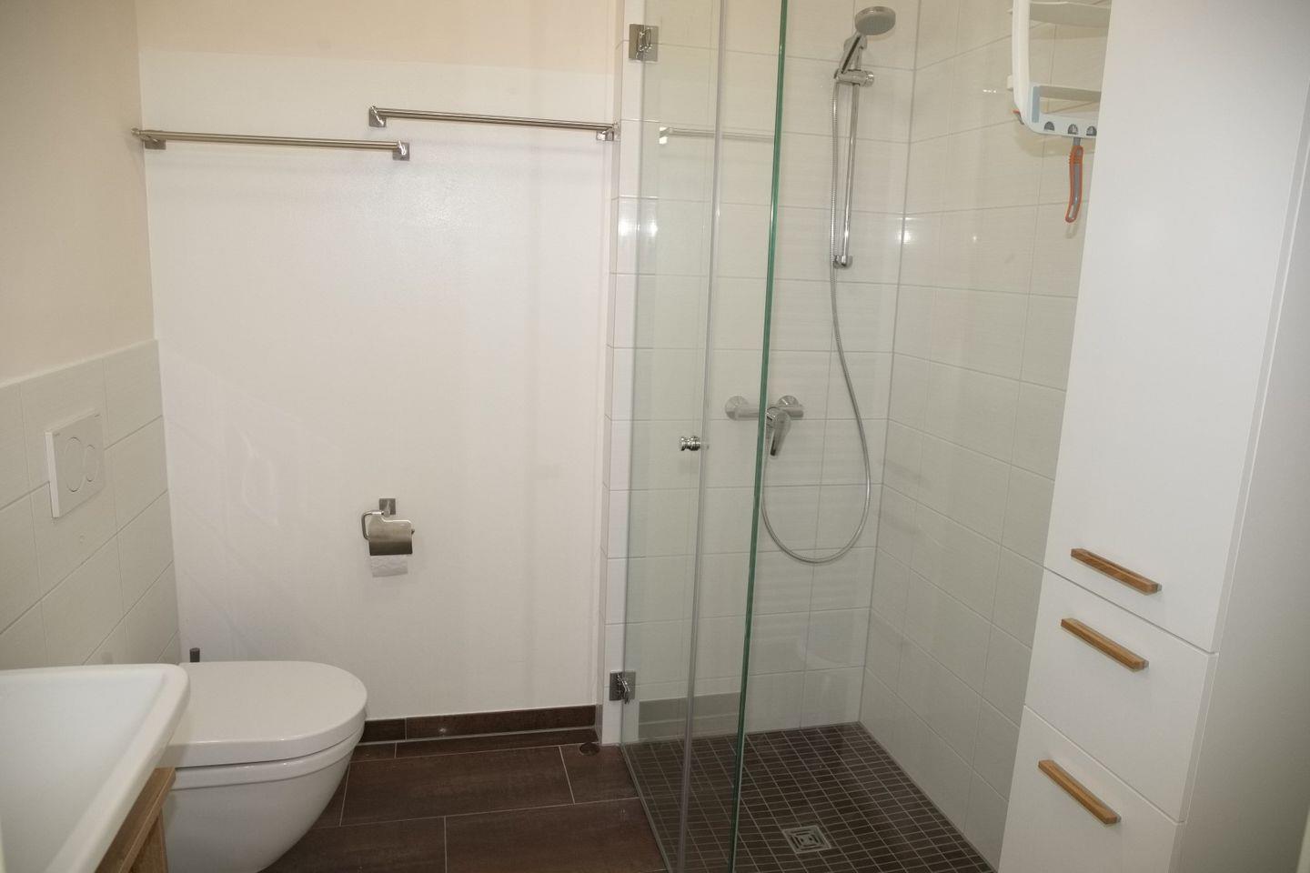 Das moderne Badezimmer überzeugt mit einer ebenerdigen Dusche, einem Waschtisch und einem Spiegelschrank und rundet das Wohlfühlambiente der Wohnung ab.