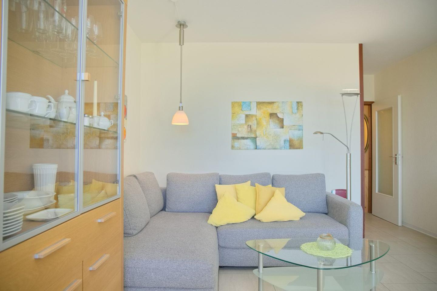 Willkommen in dieser 2-Zimmer-Ferienwohnung mit Südbalkon, die dir einen angenehmen und komfortablen Aufenthalt bietet. Die Wohnung besticht durch ein gemütliches Wohnzimmer mit einer Schlafcouch, einem großen Flachbild-TV sowie einer Stereoanlage mit Bluray-Player.