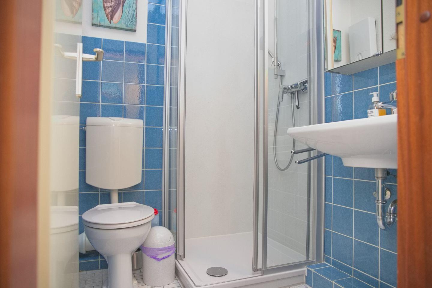 Das moderne Badezimmer ist mit einer Dusche, WC, einem Spiegelschrank und einem Handtuchheizkörper ausgestattet.